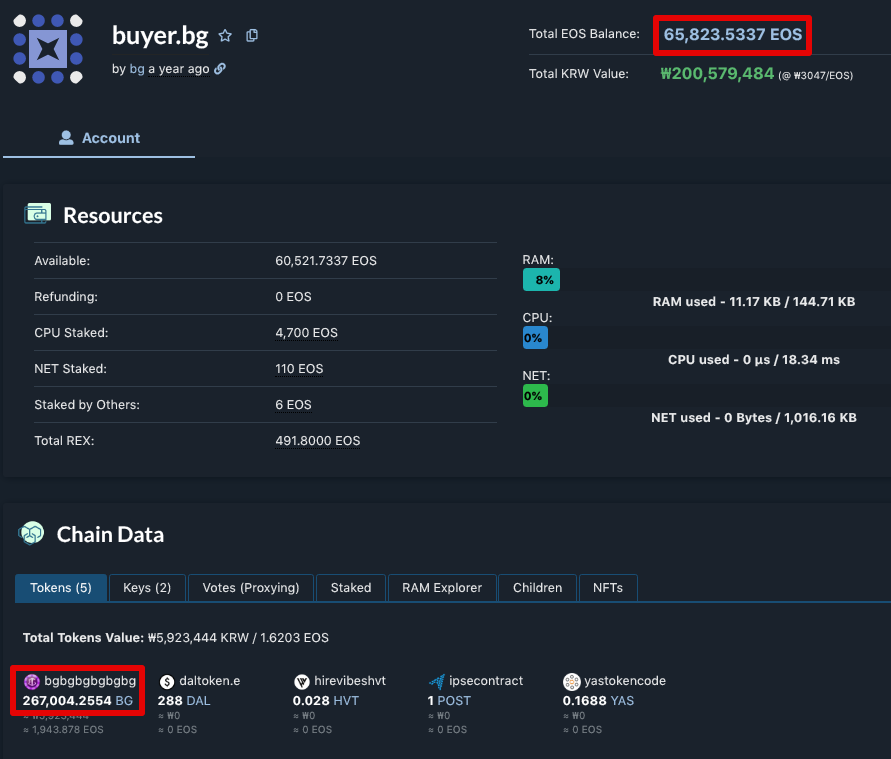 한 유저는 오랫동안 뱅커에 투자하여 5만 eos가 넘게 수익을 보았고 BG토큰은 자동채굴되어 덤으로 얻게 되었습니다. 채굴을 통해 얻게된 BG토큰의 가치도 몇만 EOS에 해당합니다.