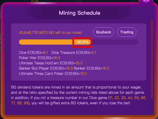 뱅커가 많은 승리를 가져감에 따라서 플레이어 채굴 난이도를 350%까지 조정 토큰이 많이 풀림에 따라 bg/eos 가격은 다소 낮아지다가 뱅커의 계속된 승리로 플레이어의 자금 사정도 나빠져 볼륨이 줄어들며 배당이 큰폭으로 떨어지는 악순환에 빠져 불안한 홀더들의 매물이 나온 것으로 파악됩니다. 플레이어에게 행운이 오길 바라며