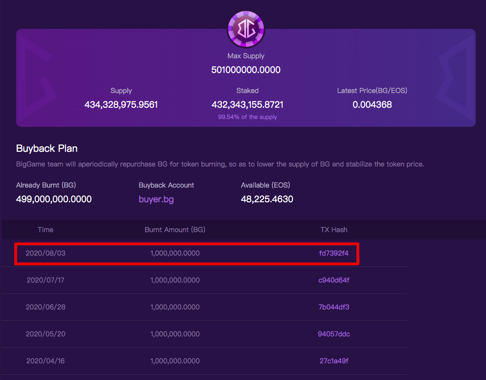 8월 3일 빅게임은 시장에서 BG토큰을 매입하였고 100만개를 소각하였습니다. 현재까지 총 22번 소각을 진행하였고 4억 9,900만개의 토큰이 소각되었습니다. BG 토큰의 가격이 급등하는 등의 특이 사항이 없을 경우 비지 팀은 매달 200만개의 토큰을 바이백하여 소각할 계획입니다. BG토큰 200만개의 가격은 EOS 3700원 기준 3,420만원에 해당하며 매달 소각됩니다.