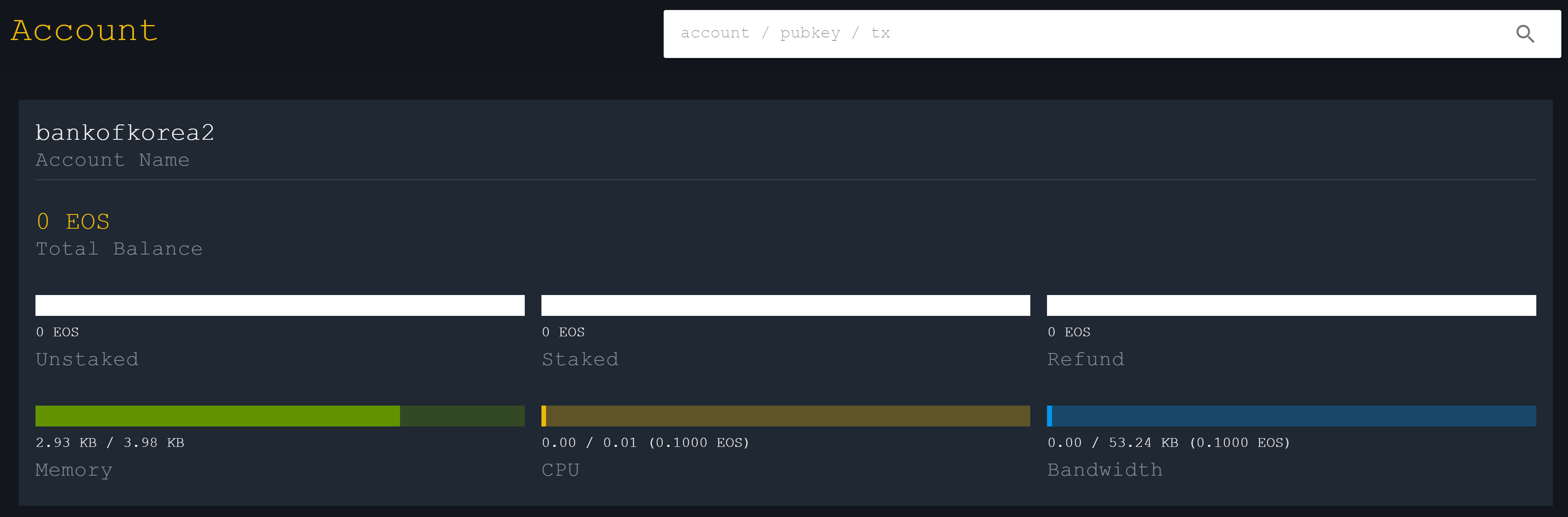 EOS 계정이 제대로 작동하려면, 4kb의 메모리(RAM)가 필요합니다. 새로운 EOS 계정을 생성하기 위해선, 이미 EOS 계정을 가지고 있는 사람이 일정 수수료를 지불해야 합니다. EOS는 이더리움처럼 특정 퍼블릭 주소로 자산을 송금할 수 있는 구조가 아닙니다. 소량의 메모리와 이오스 계정에 연결된 퍼블릭키가 없다면 EOS 입출금이 불가능합니다.
