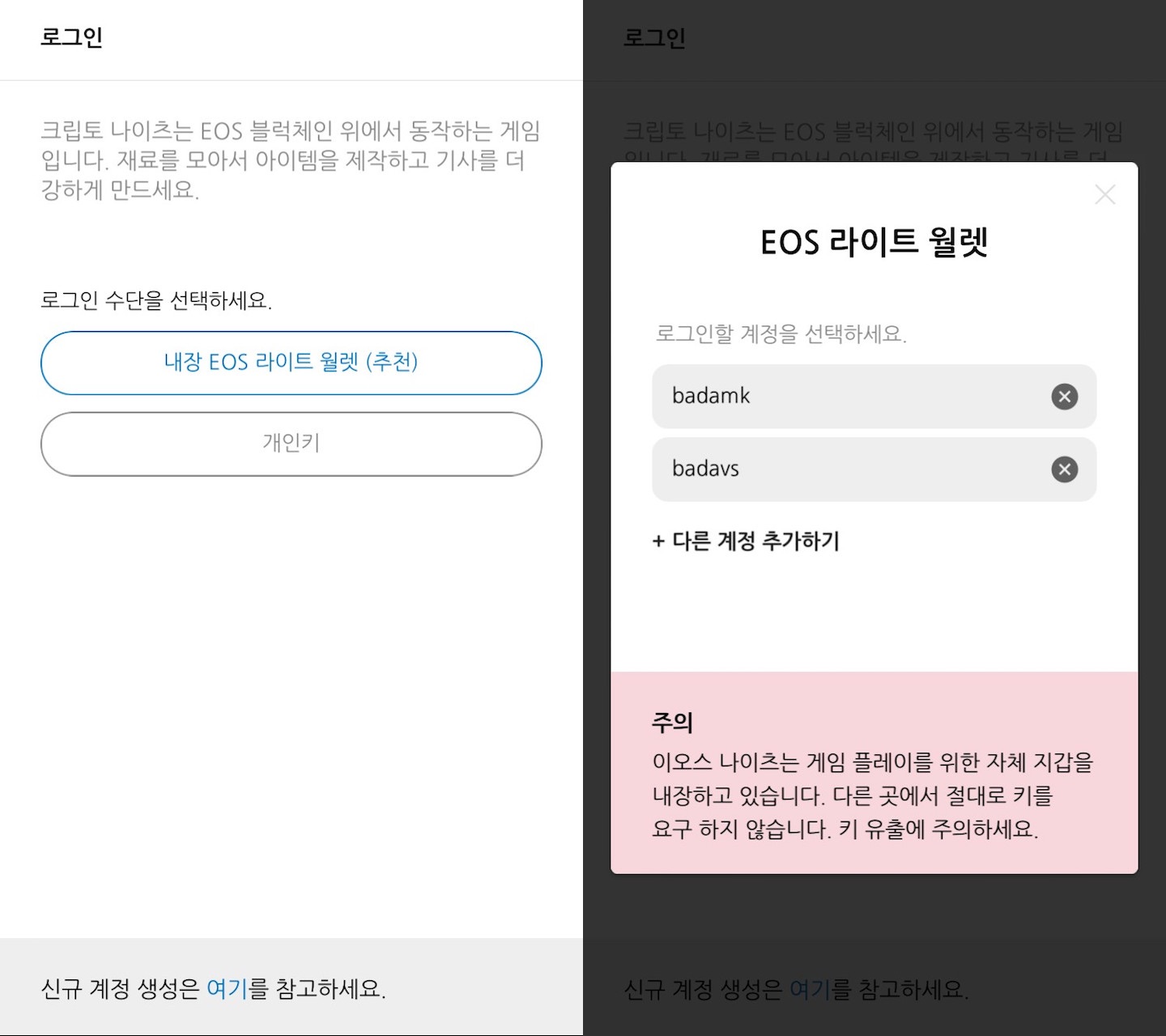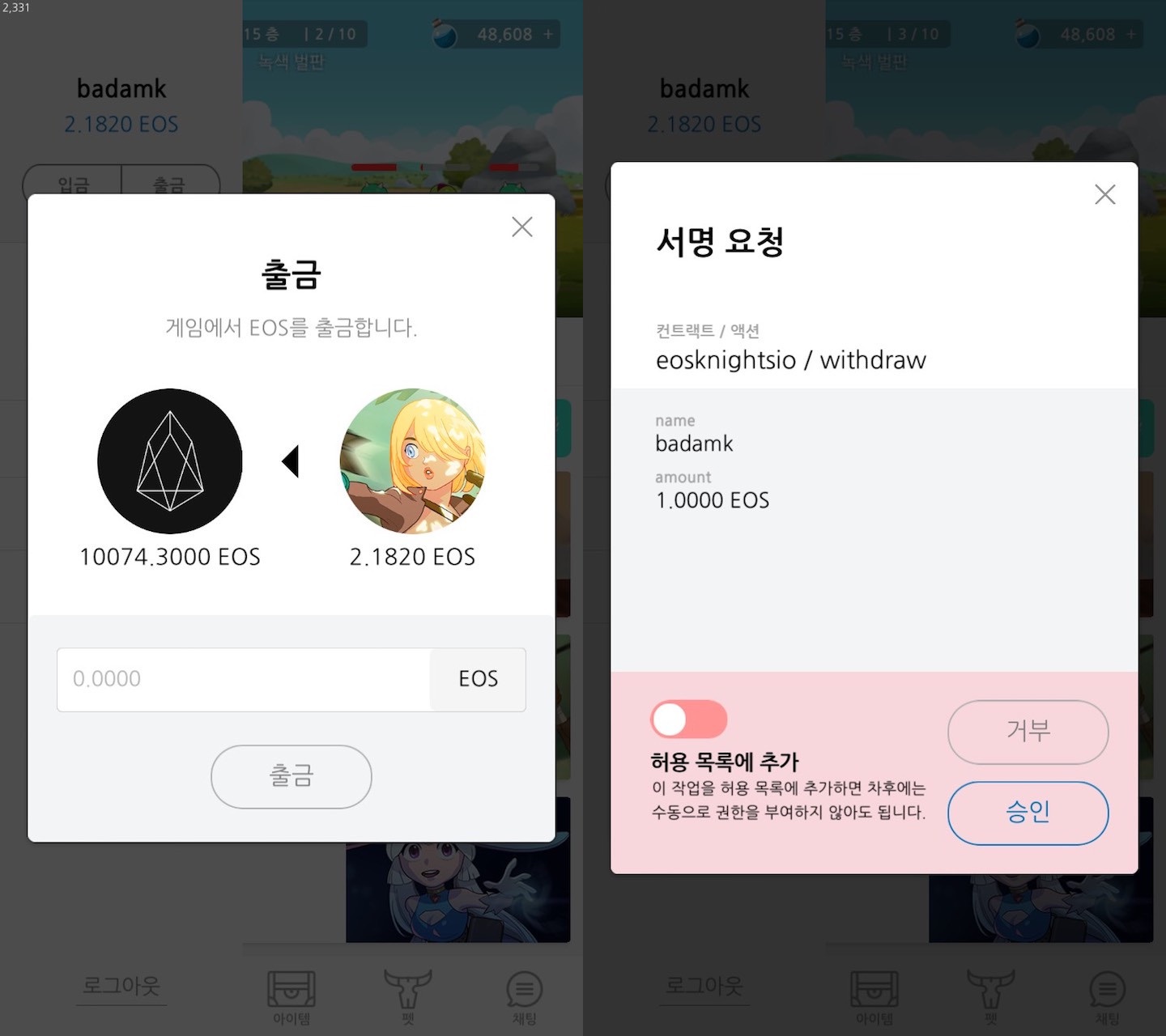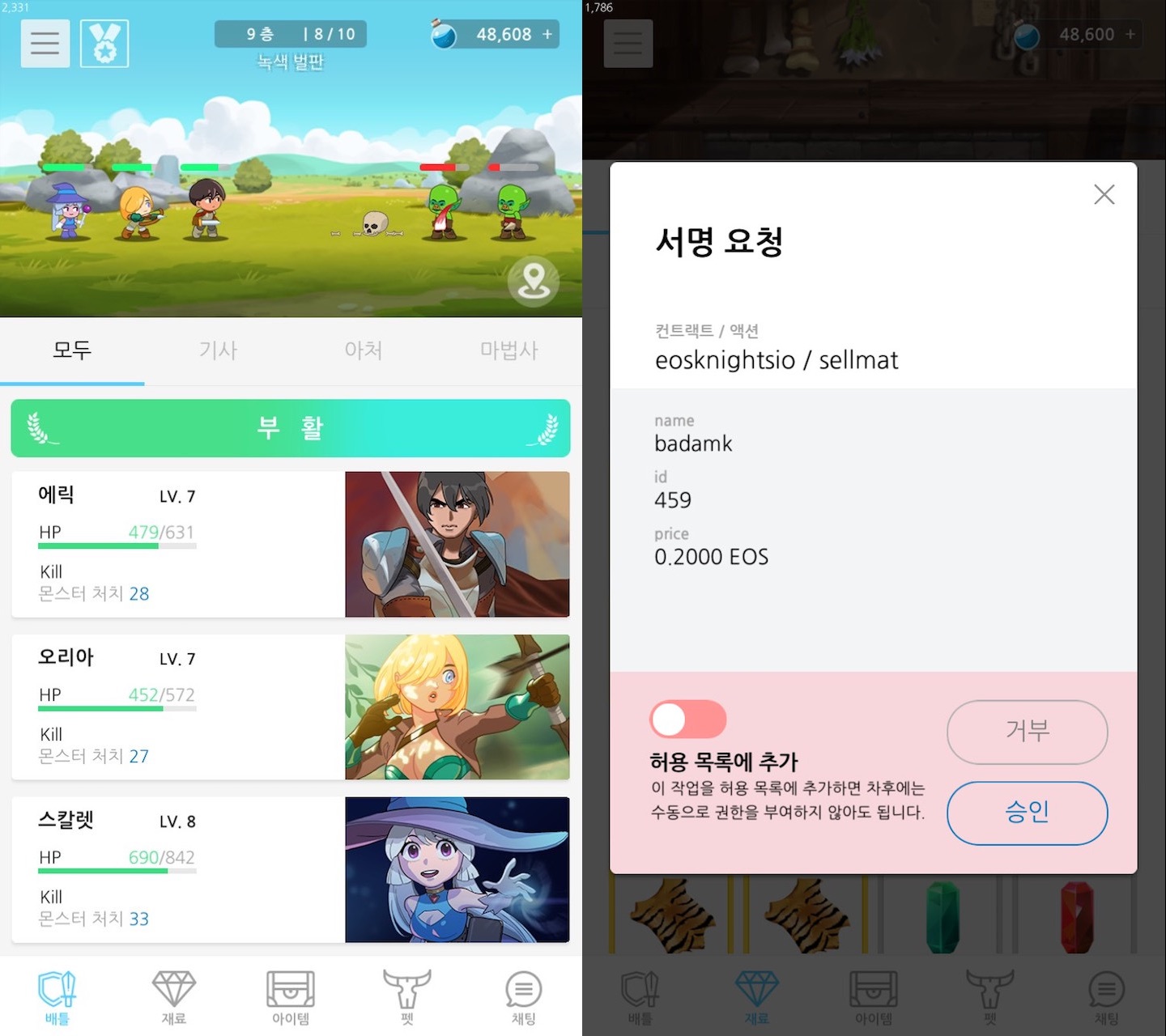 EOS Knights는 모바일 게임입니다. 아쉽게도 스캐터와 같은 지갑이 아직 모바일에는 없습니다. 그래서 지갑을 앱에 내장하기로 했습니다. 지갑에 등록된 키는 OS 키체인에 안전하게 암호화해서 저장하도록 했습니다. 내장 지갑을 이용하면 모든 트랜잭션에 대해 유저의 서명을 받도록 했습니다.