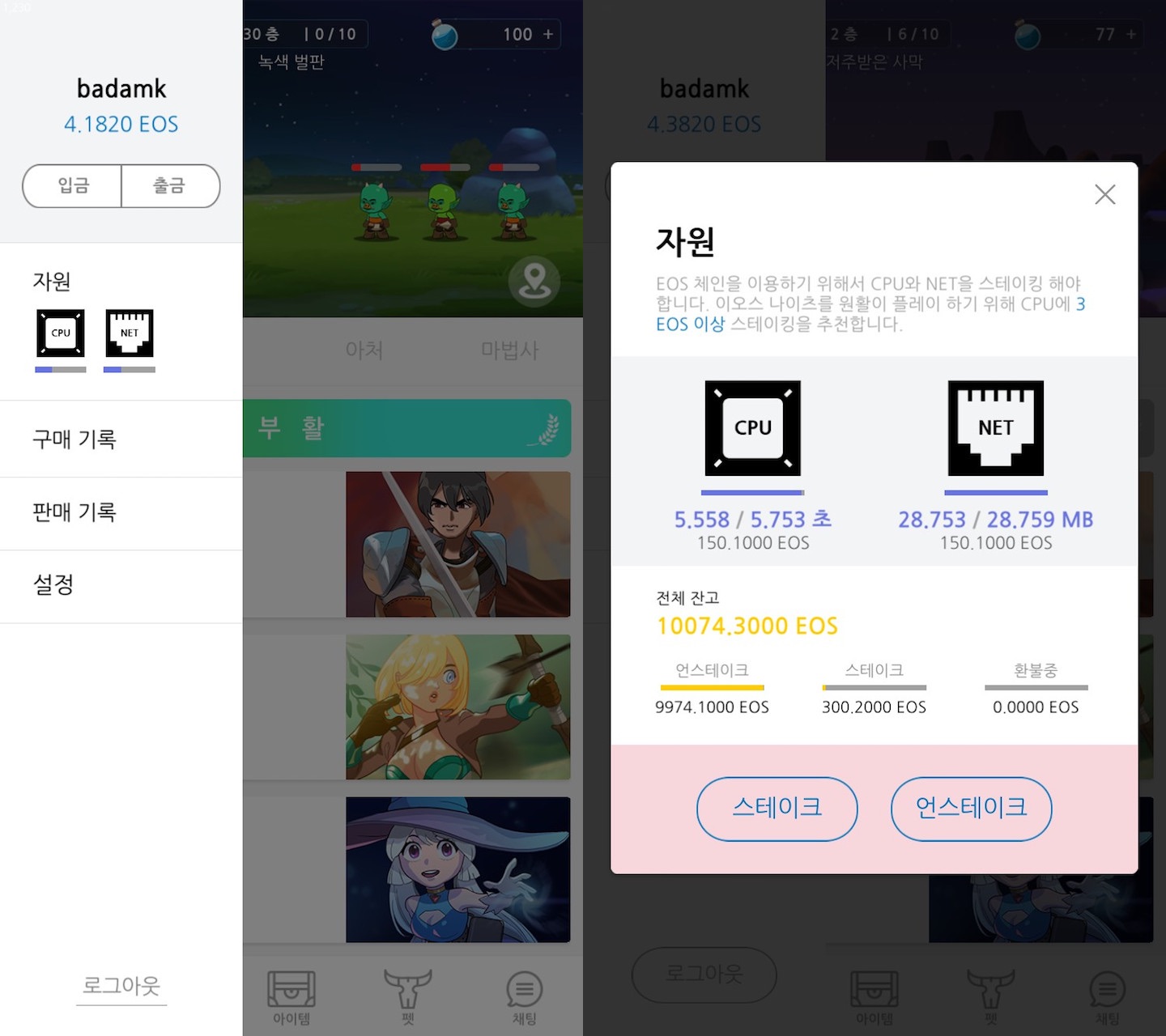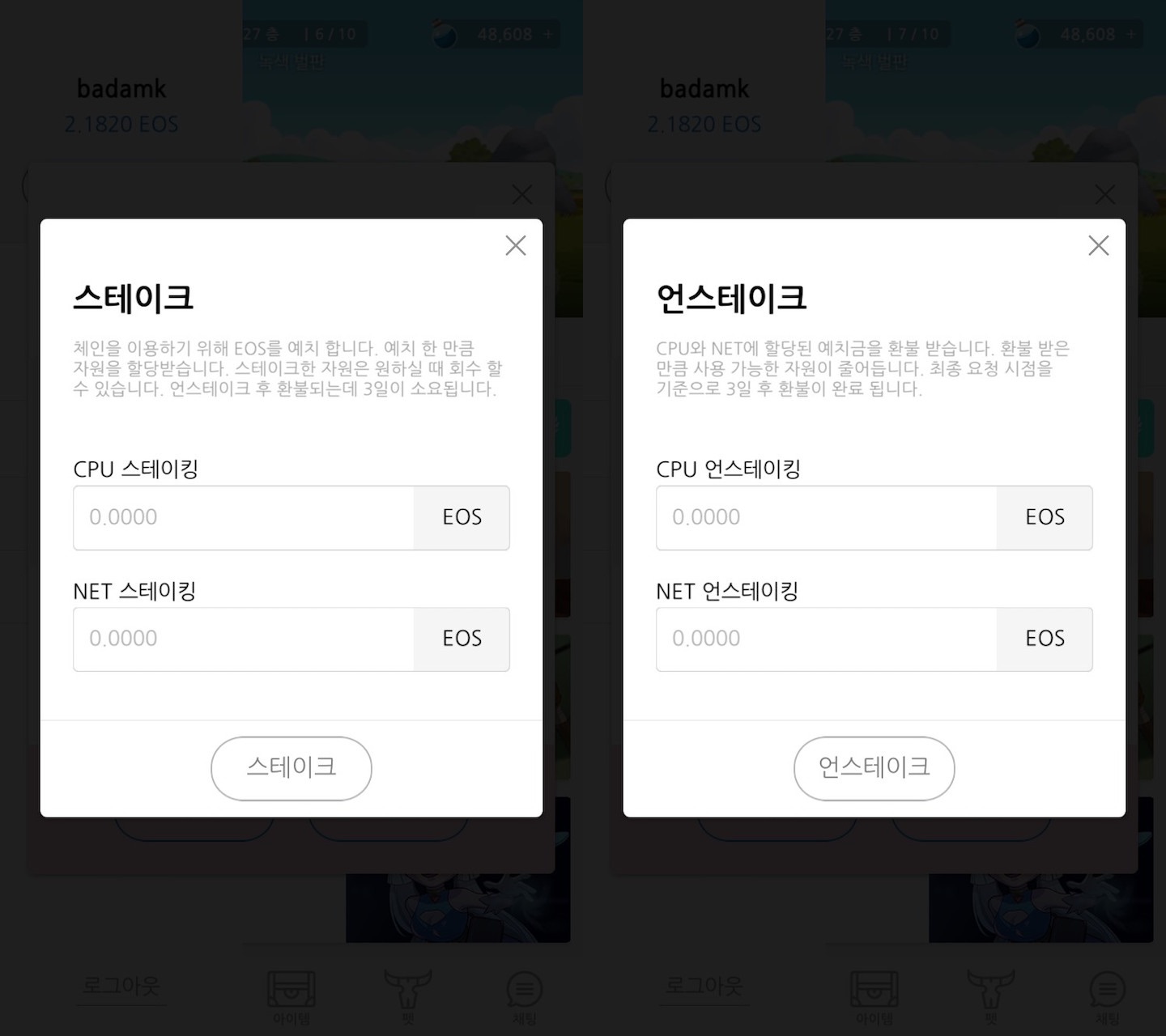 CPU는 비싼 자원입니다. 체인에 트랜잭션을 일으킬 때마다 가용한 CPU 자원이 유저에게서 소모됩니다. CPU 소모를 줄이기 위해 일 평균 300번의 트랜잭션이 일어나게 설계했던 것을 50번 정도가 일어나게 스펙을 조정했습니다. 그럼에도 불구하고 이정도를 커버하기 위해서는 3 EOS 이상이 스테이킹 되어 있어야 합니다. 유저가 외부에서 스테이킹을 해서 진입하는것은 너무 어렵기 때문에 앱 내에 스테이킹 툴을 내장했습니다.