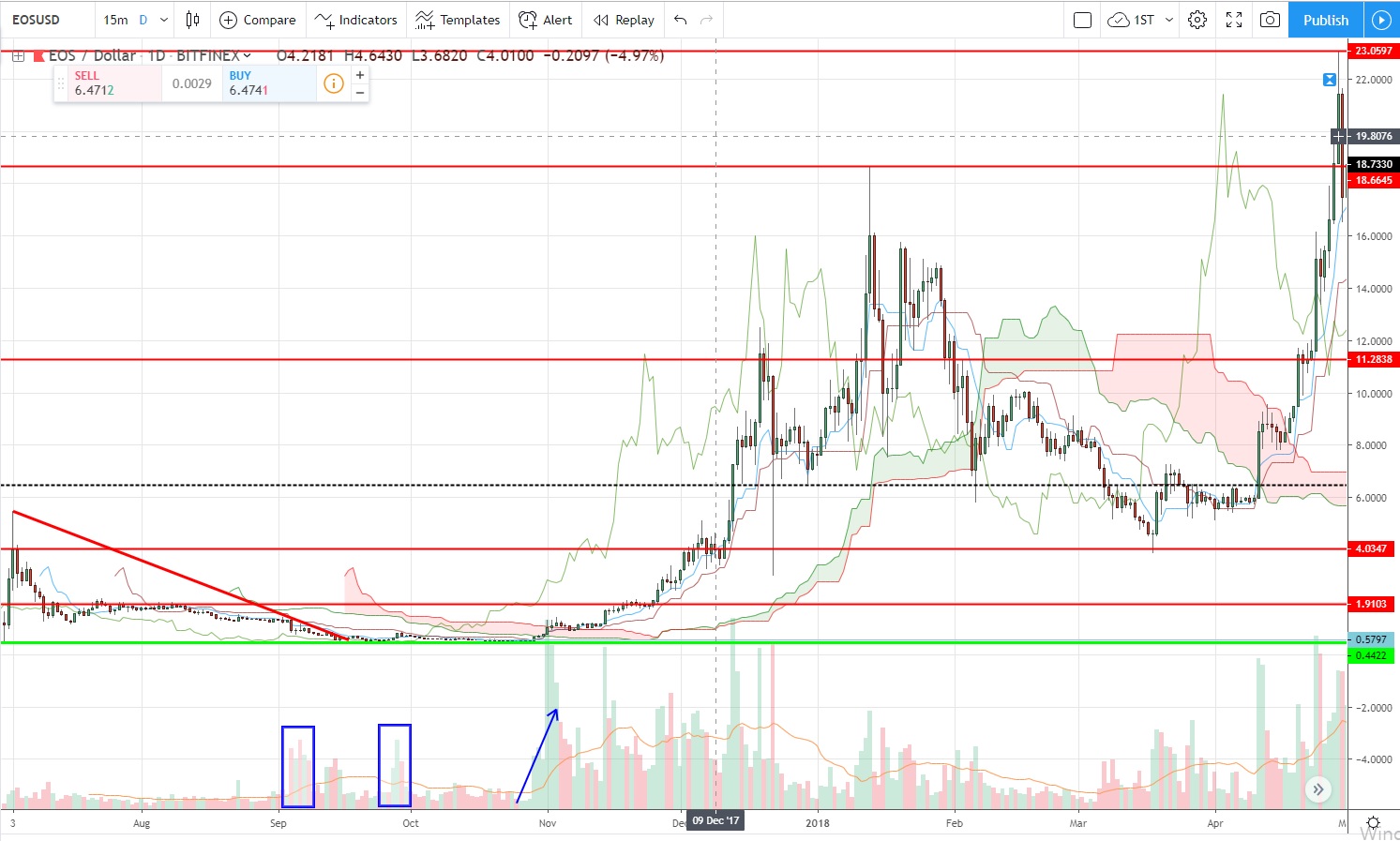 - 이오스에 빗대어 설명하자면 하락채널의 마지막 단계에서 큰 거래량을 동반하여 횡보채널로 전환할수도 있다고 볼 수 있습니다. 이오스 차트와 같이 흘러간다면 8월말 즈음이 펌핑의 시작이겠군요.