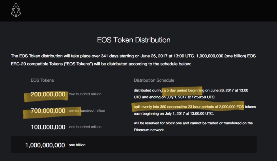 - 보시는 바와 같이, 먼저 5일간 2억개를 1차로 팔고, 이후 350일간 하루에 200만개씩 총 7억개를 2차로 파는 형태로 EOS ICO는 이루어 졌습니다.
