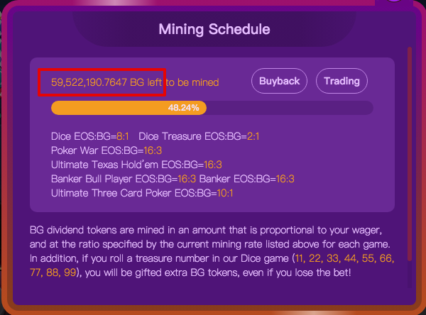 소각완료 후에도 바이백 계정에는 65,115eos가 적립중이고 BG토큰 또한 64만개 이상 적립중입니다. 베팅 볼륨은 매일 꾸준하며 바이백이 계속 진행되어도 베팅으로 바이백 계정으로 실시간으로 적립중이니 오히려 바이백 풀의 eos는 조금씩 늘어나고 있습니다.