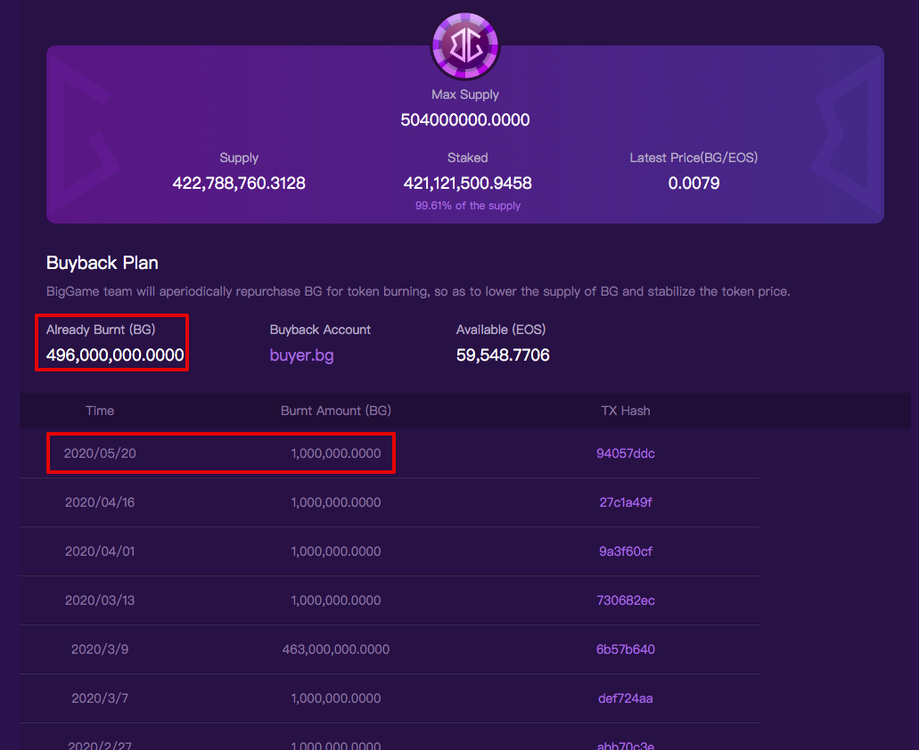 5월 20일 빅게임은 시장에서 BG토큰을 매입하였고 100만개를 소각하였습니다. 현재까지 총 19번 소각을 진행하였고 4억 9,600만개의 토큰이 소각되었습니다. BG 토큰의 가격이 급등하는 등의 특이 사항이 없을 경우 비지 팀은 매달 200만개의 토큰을 바이백하여 소각할 계획입니다. BG토큰 200만개의 가격은 EOS 3200원 기준 5,120만원에 해당하며 매달 소각됩니다.