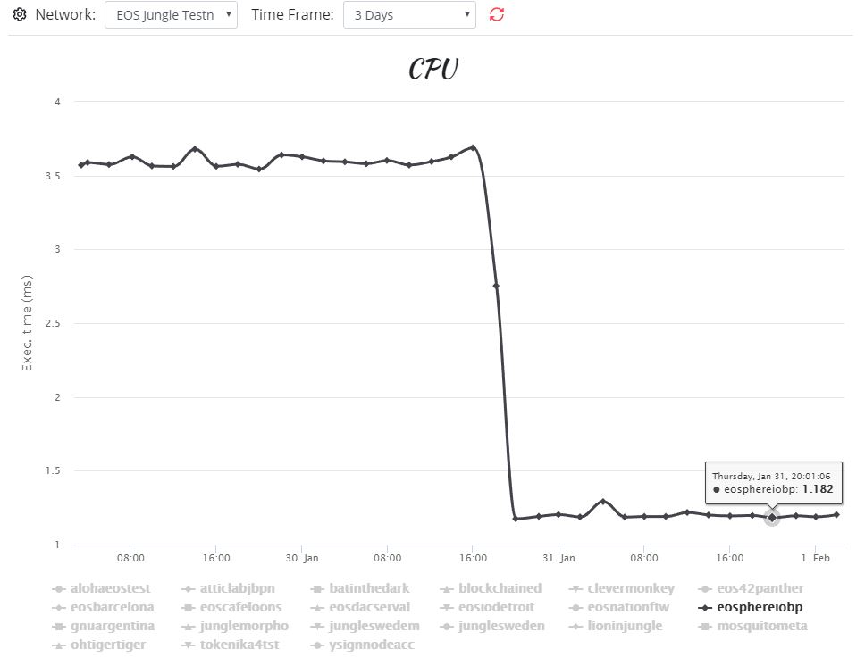 Our Block Production nodes run on quick current Generation Intel XEON E3-1240 v6 CPU’s with DDR4 RAM also using SuperMicro servers. Although not the most expensive CPU’s, with us having BIOS level access we are able to adjust the processor performance settings giving us a sustained clock speed of 4.0 – 4.1GHz with excellent results. Below are our Jungle Testnet performance metrics which are reliably in the 1.1ms range.