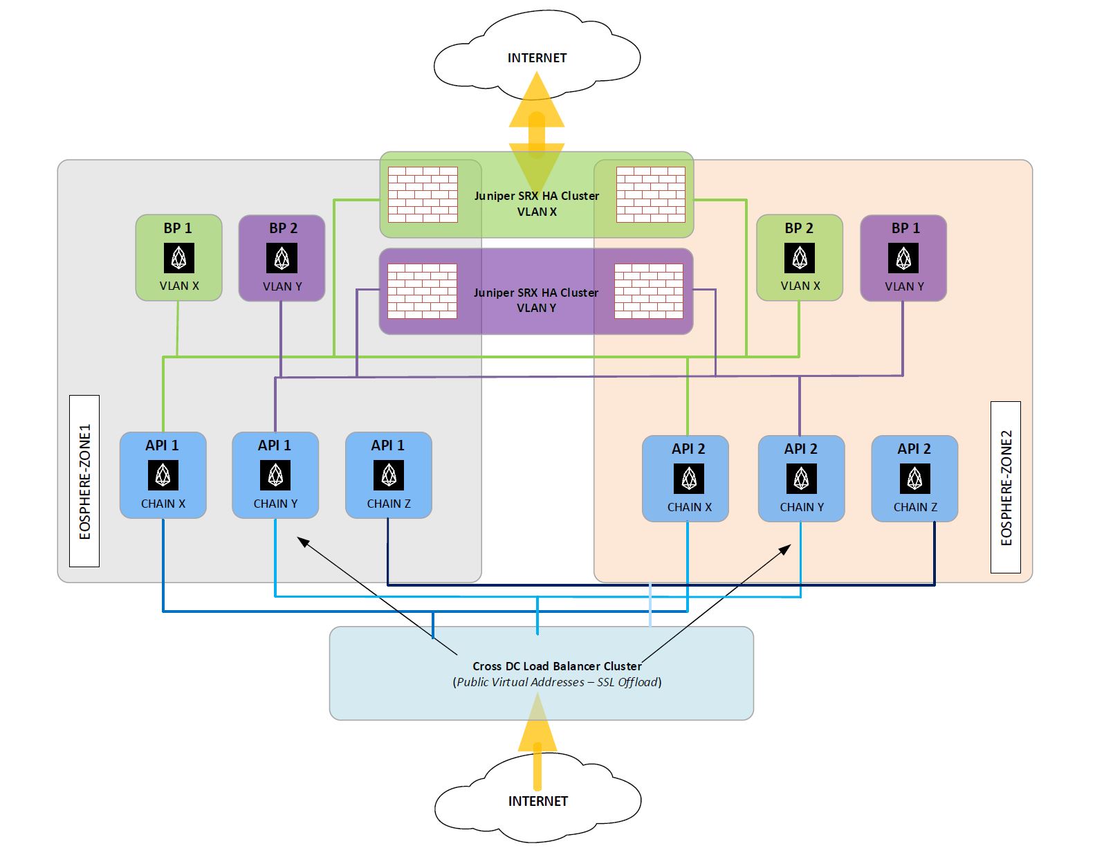 Client API requests come in from diverse upstream services providers with DDoS protection landing on a cluster of loadbalancers which are located across both SY3 and SY4. These loadbalancers provide SSL offloading and acceleration forwarding HTTP requests in an intelligent highly available round robin fashion to the relevant EOSIO API servers.