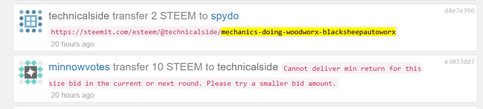 I'm not coprophiliac, so if you are into scat, then don't count on me sorry. In my comment you just replied to I gave you a hint that (A) bots sometimes do have some rules and/or blacklists, and (B) steemyoda rejected your "private message". This is a bot. It considers all messages to be bids. Find the owner of the bot and try contacting him if you want a refund. *) Regarding rules/blacklists on specific bot - I can't tell you, really. It's up to the bot's owner. YMMV.