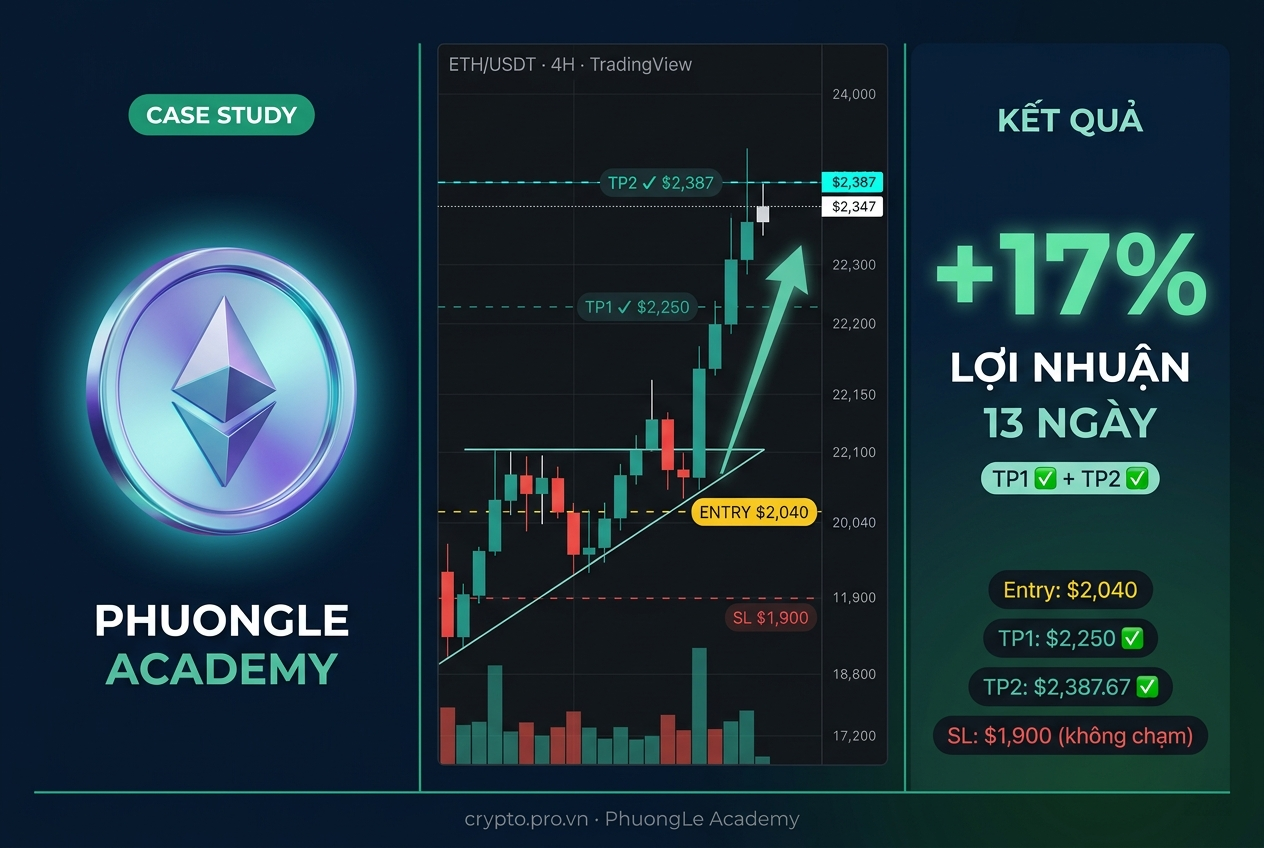 📋 CASE STUDY THỰC CHIẾN · TP1 HIT ✅ · TP2 HIT ✅ PL Phuong Le — Admin Học Viện Academy.PhuongLe.top Founder Crypto.Pro.Vn · Nhà giao dịch Crypto chuyên nghiệp · Cập nhật: 17/04/2026 KẾT QUẢ THỰC CHIẾN Ngày 17/04/2026 — đúng 13 ngày sau khi vào lệnh $ETH tại $2,040, cả hai mục tiê