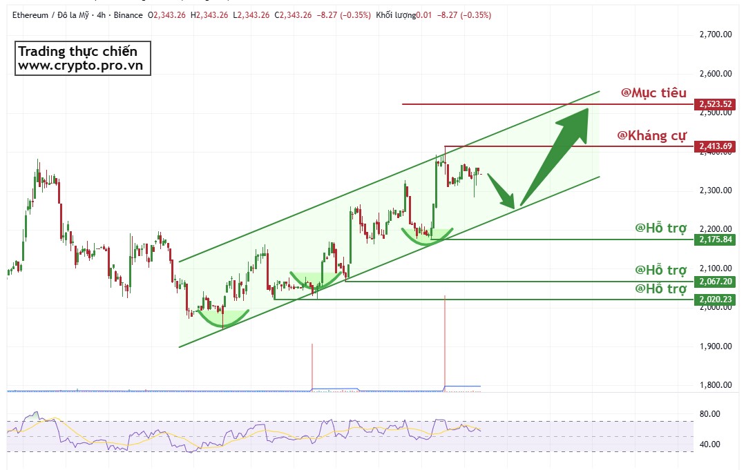 Ethereum đang duy trì xu hướng tăng trong một kênh giá rõ ràng trên khung thời gian 4 giờ. Sau một đợt điều chỉnh nhẹ, giá đang có dấu hiệu tìm lại vùng hỗ trợ dưới của kênh, tạo cơ hội cho một đợt tăng trưởng tiếp theo.