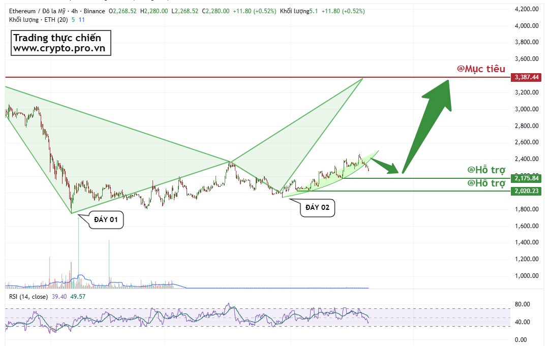 Dựa trên phân tích biểu đồ 4 giờ của Ethereum (ETH/USD), giá đang cho thấy một xu hướng phục hồi tích cực sau khi hình thành mô hình hai đáy (Double Bottom) tại các mức $Đáy 01 và $Đáy 02. Hiện tại, ETH đang giao dịch ở mức $2,280.00, duy trì trên các vùng hỗ trợ quan trọng $2,175.84 và $2,020.23.