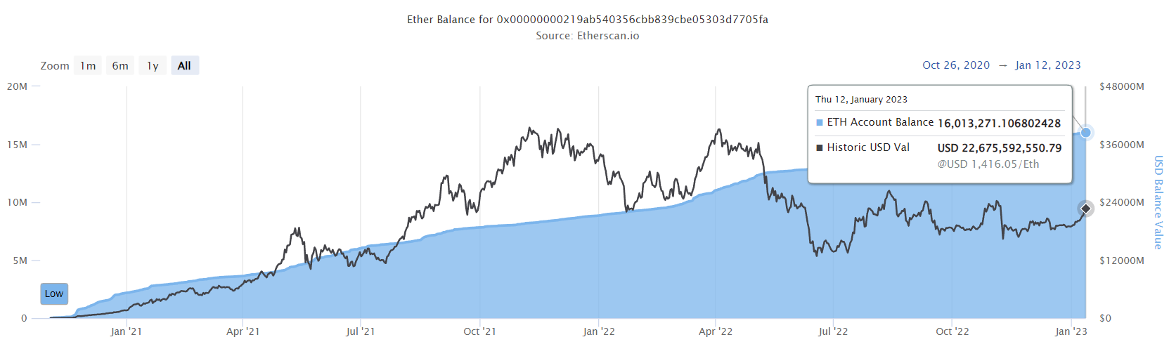 Following Ethereum's transition to PoS, validators' funds placed in a deposit contract remain staked. The combined volume currently exceeds 16 million ETH or $22.5 billion, which equates to 13% of the coin's total supply.