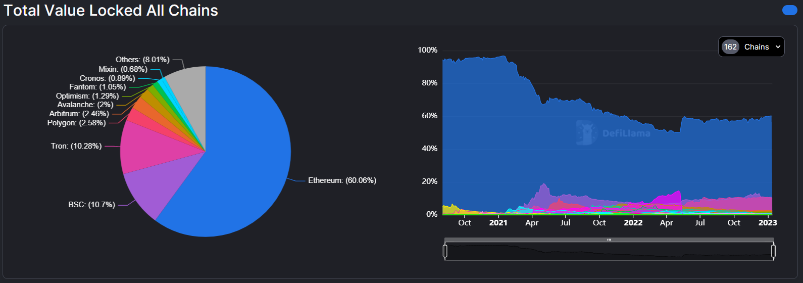 The loss of momentum stemmed from increased competition in those sectors, but the trend changed after Terra (LUNA) collapsed in May 2022. Ethereum's share has increased from 50% to 60% from then, as it remains the most trusted one among blockchains supporting smart contracts according to community evaluations.