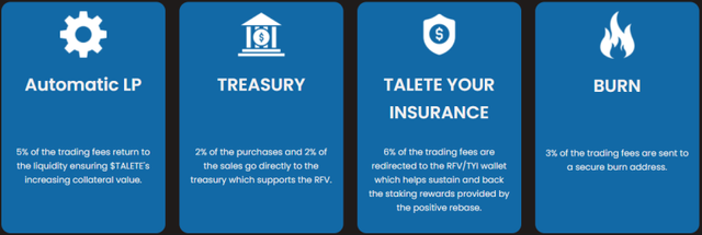 6% of trading fees are redirected to the RFV/TYI wallet which helps maintain and return the staking rewards provided by the positive rebase.