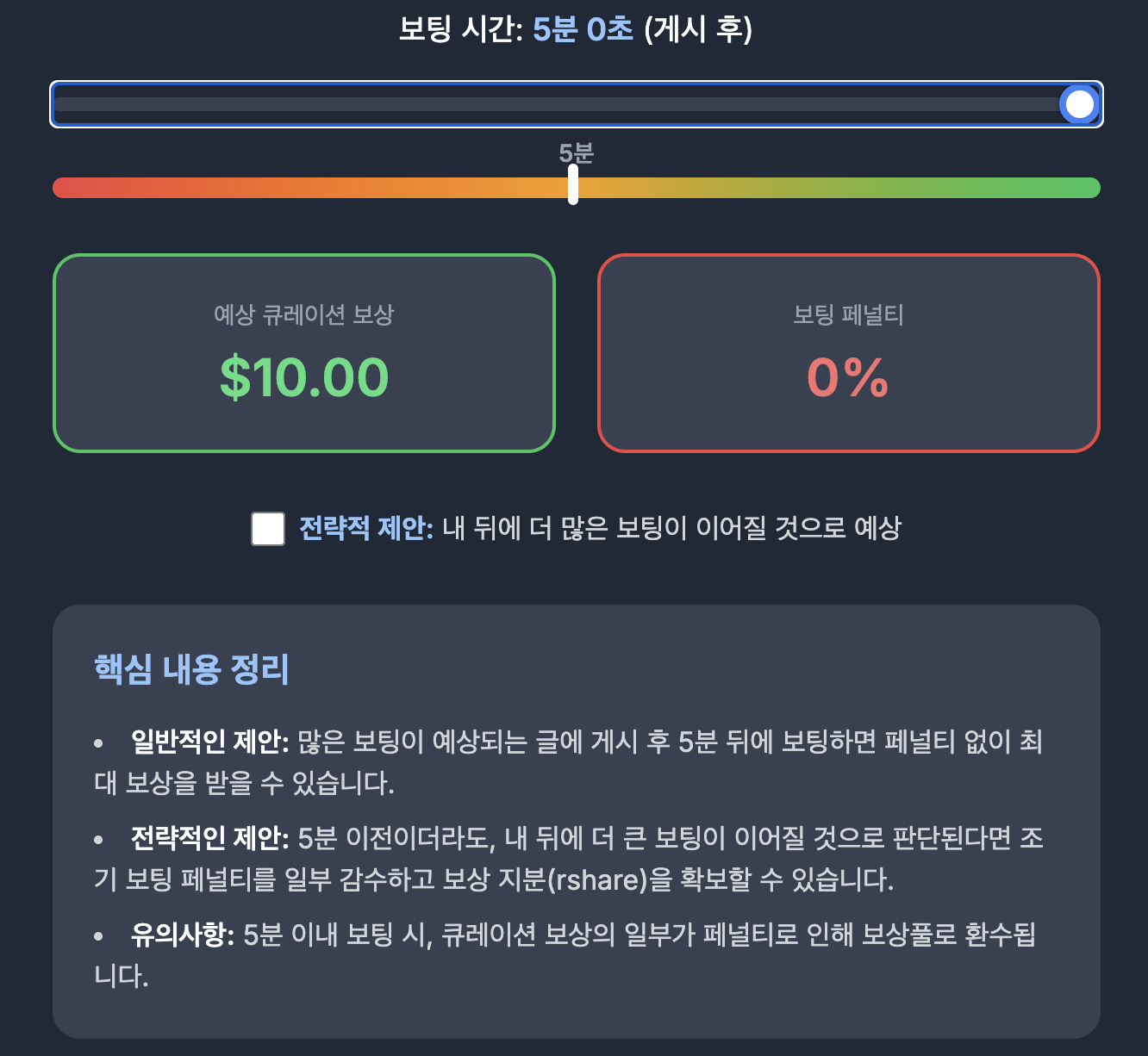 - (전략적인 제안) 글이 게시된지 5분이 지나지 않았다 하더라도 내 뒤에 더 많은 (보상지분rshare이 큰)보팅이 이어질 것으로 판단된다면, 빠른 보팅 페널티를 일부 감수하며 5분 이전에 보팅 할 수도 있다.