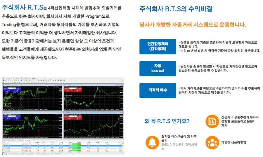 주식회사 R.T.S에서 자체 운영하는 엑사비트 거래소이며 외환거래를 주축으로 하는 회사입니다.