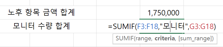 F3에서 F18까지 모니터가 들어간 수량만 합계를 구했습니다.