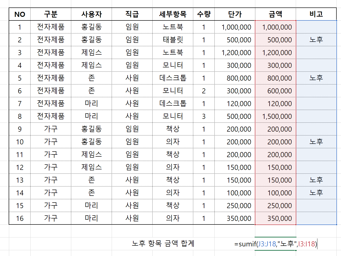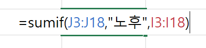 J열 3행에서 J열 18행 까지 "노후" 란 단어가 들어간 같은 행의 값을 I열 3행에서 I열 18행에서 조회하여 합계를 구하라는 의미입니다.