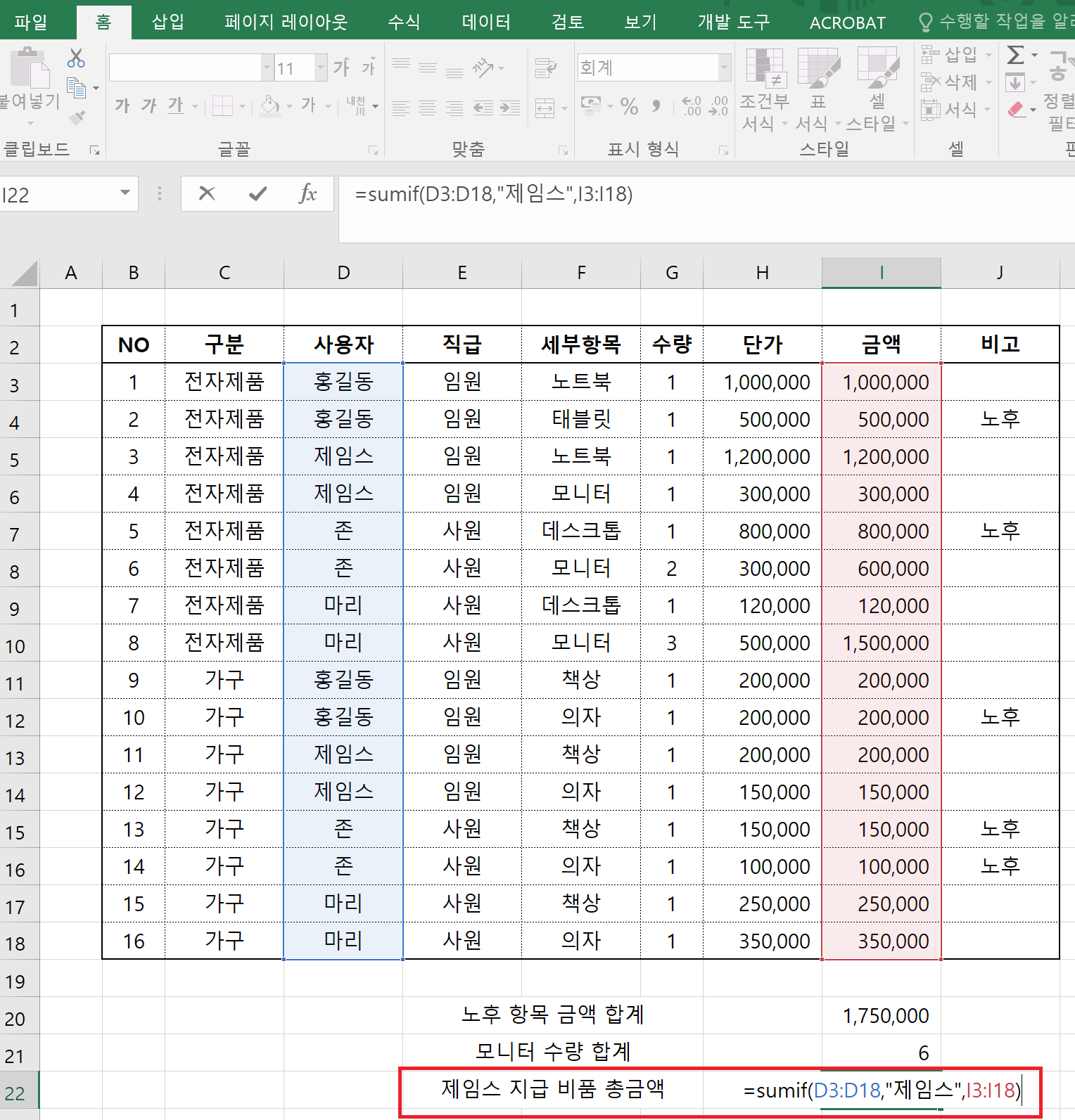 사용자 부분의 D3부터 D18에서 제임스를 검색하여 금액의 합계를 구했습니다.