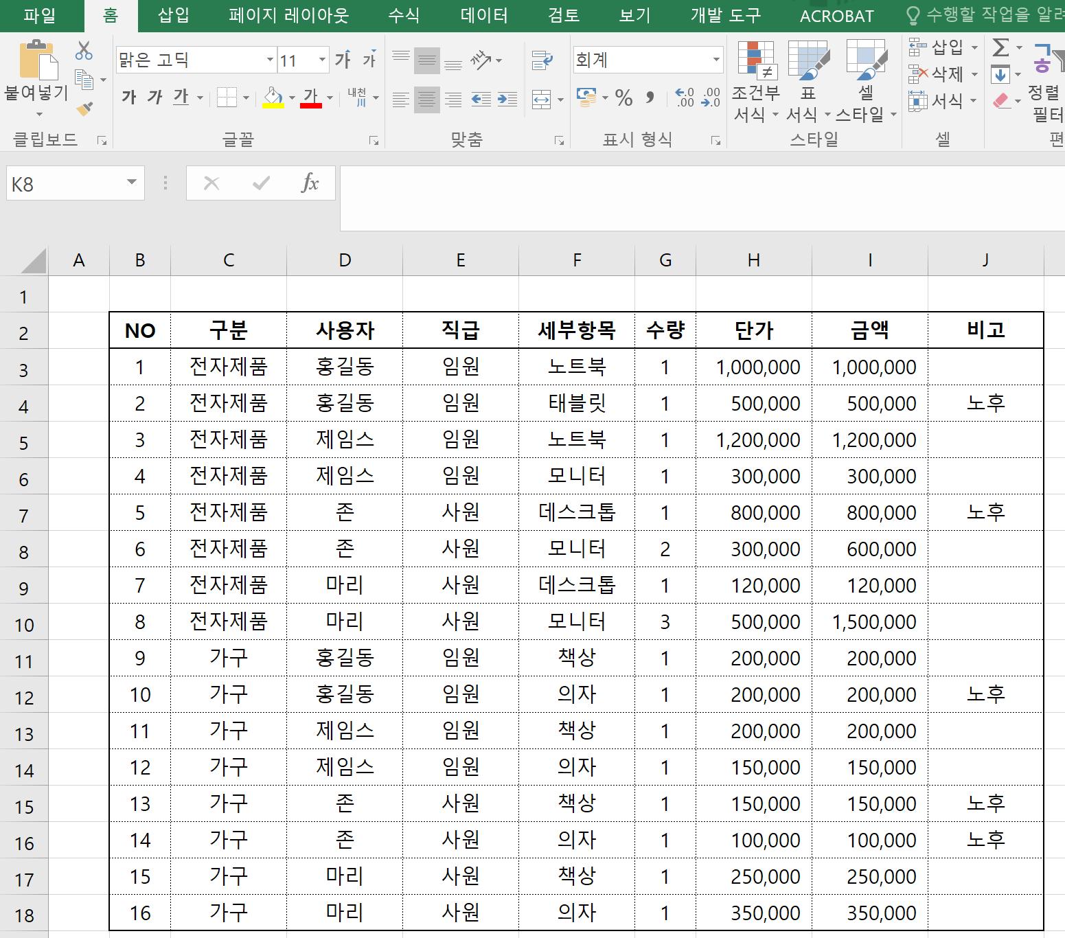 그리고 비고 란에 노후된 장비는 노후라고 표시하여 두었습니다.