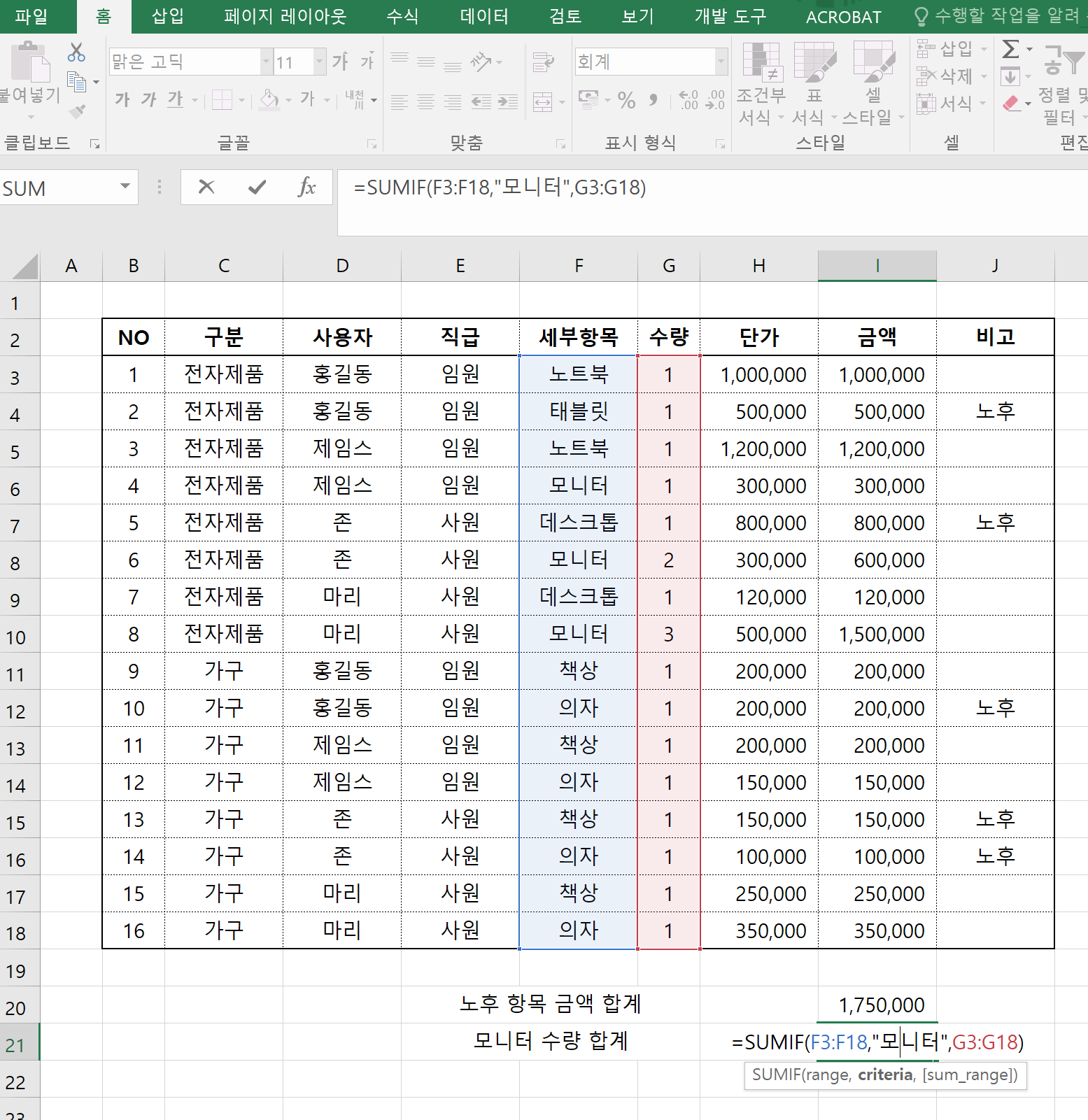 그럼 조건을 모니터로 하고 수량에서 합계를 구하면 되겠죠?