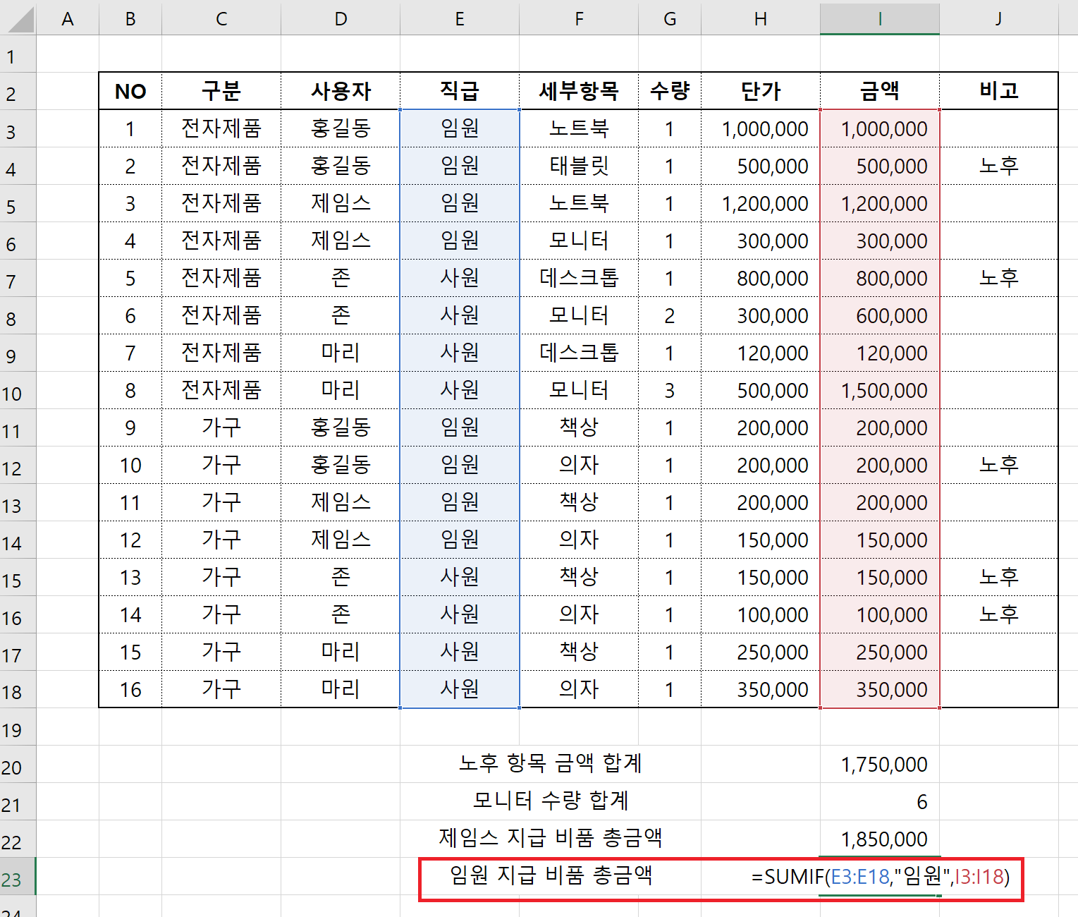 직급 부분의 E3 부터 E18 까지 임원을 검색하여 금액의 합계를 구했습니다.