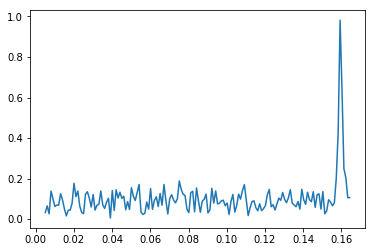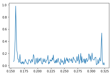 plt.plot(xf[5:165], absyf1[5:165])