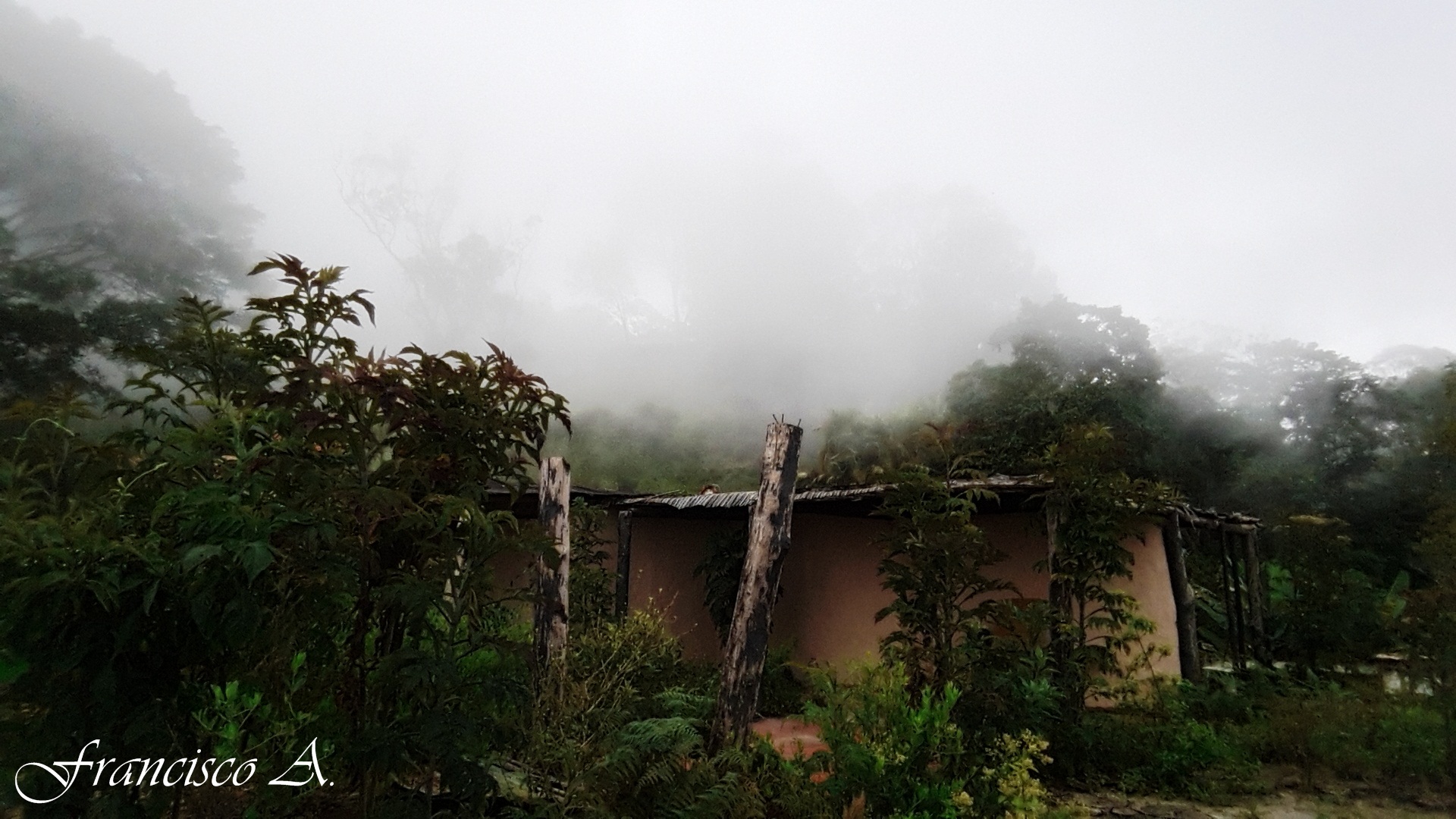 ya muy adentrado nos cayo un palo de agua y no pudimos seguir fotografiando por eso no logre una toma desde afuera a la casa que encontramos pero en su interior se decía mucho a pesar de una casa rural se veía cómoda y acogedora ya que tenia chimenea, las columnas estaba hechas de troncos de arboles en su exterior tenia una linda vista de todo habia recuerdos en esa casa aun, me gustaría vivir en una casa como esa alejada de la civilización.