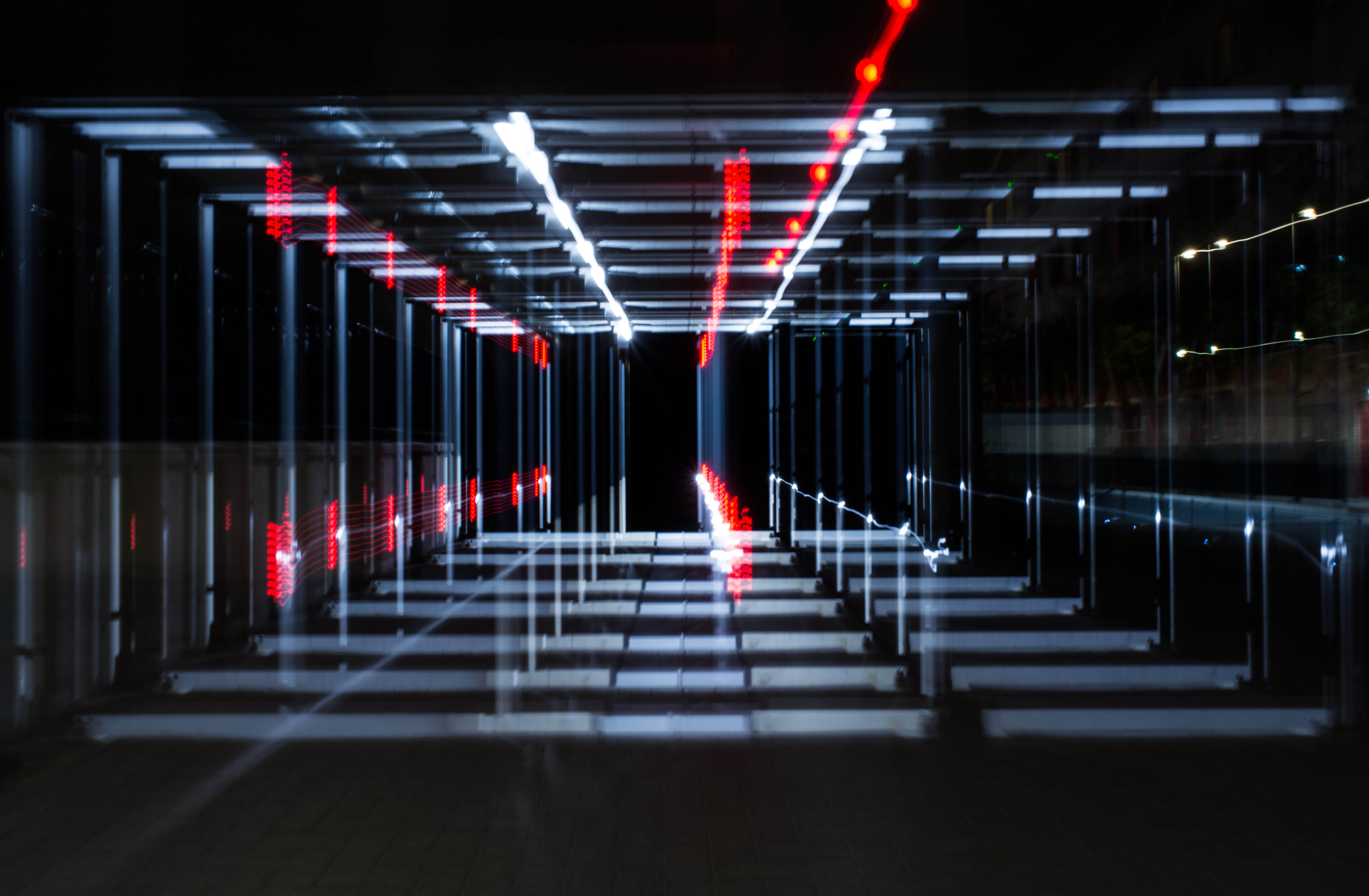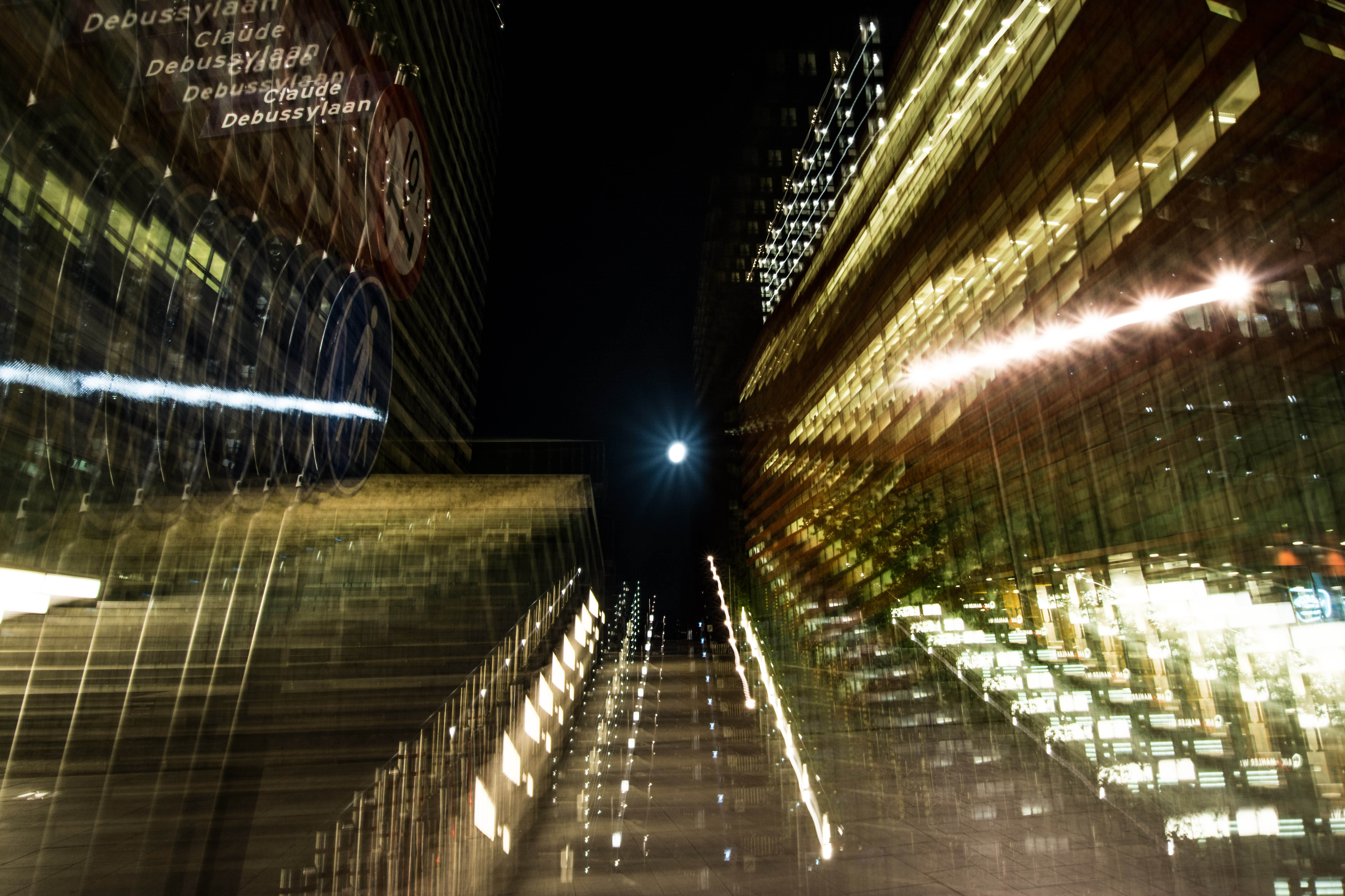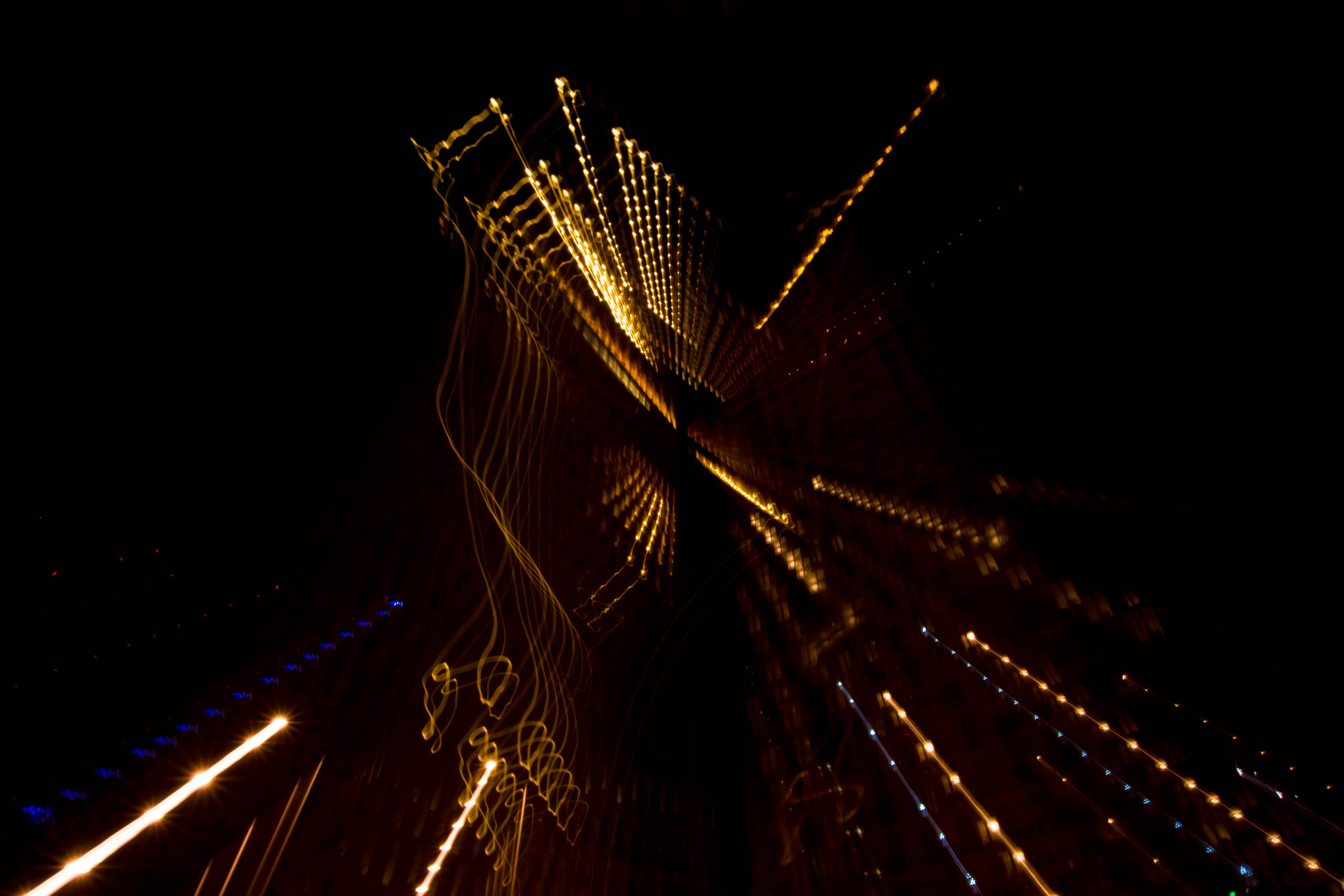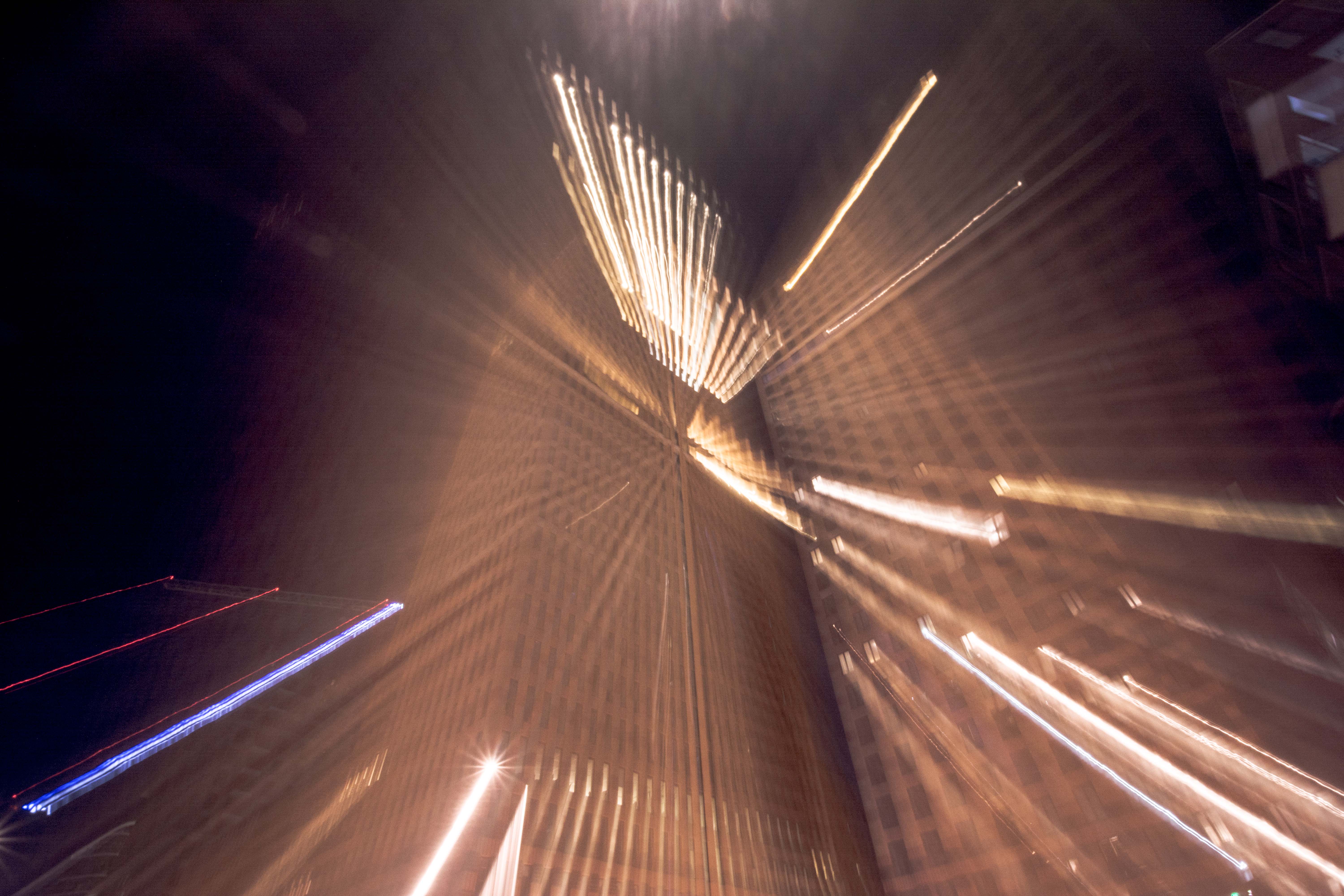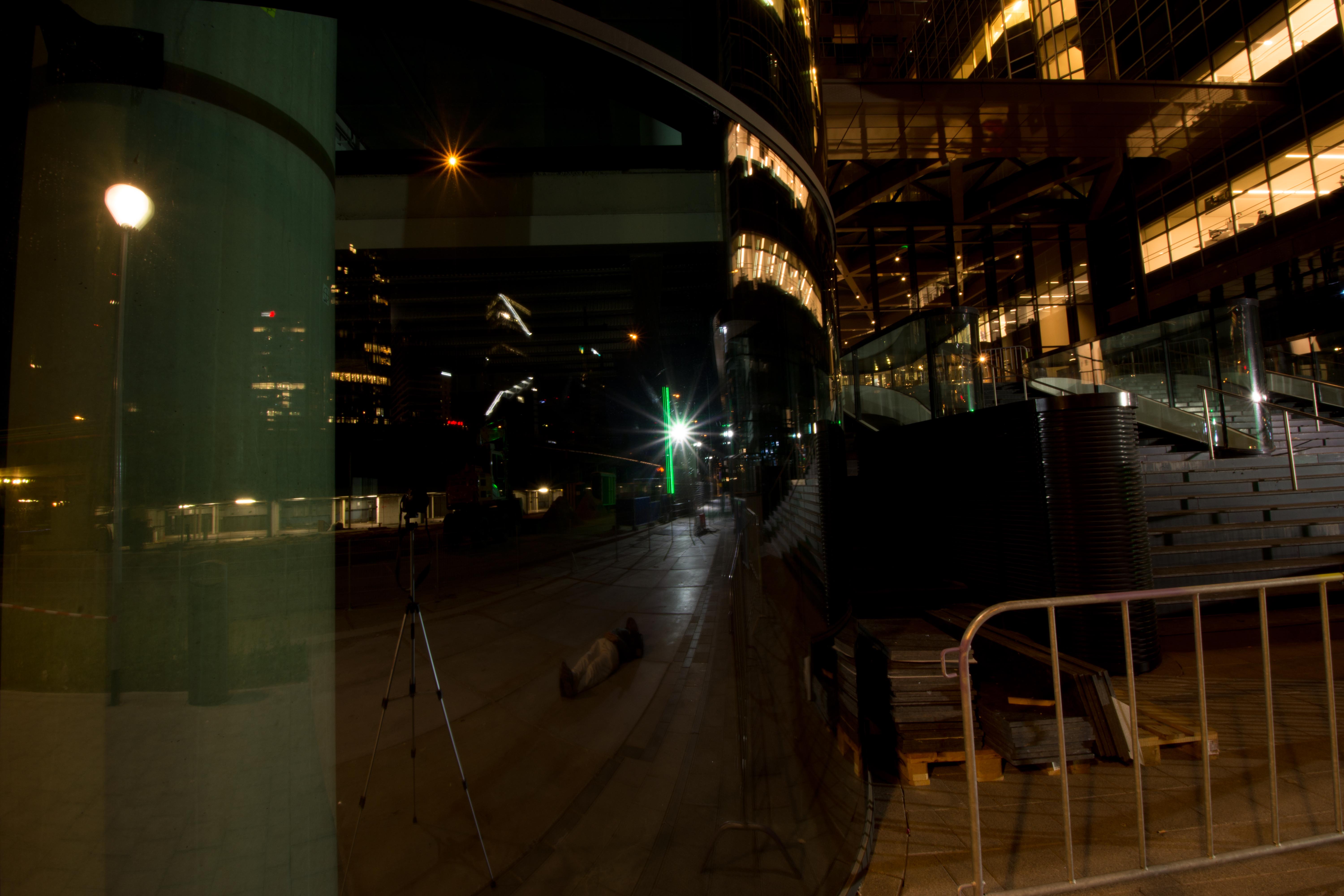 Remember when I asked you to remember this place? If not, scroll up a few pics. If you're able to do that with your goldfish fins. This is that place. After editing this pic, called 'The Hammock', I realised that there were very clear pixellated parts. Under the lower diagonal blue lines. Can you spot them? Assuming I did something wrong, I went back to the original. I saw them there as well! Turns out they're not pixels, but reflections of corner edges of buildings, copied by the long exposure, stepwise zooming.