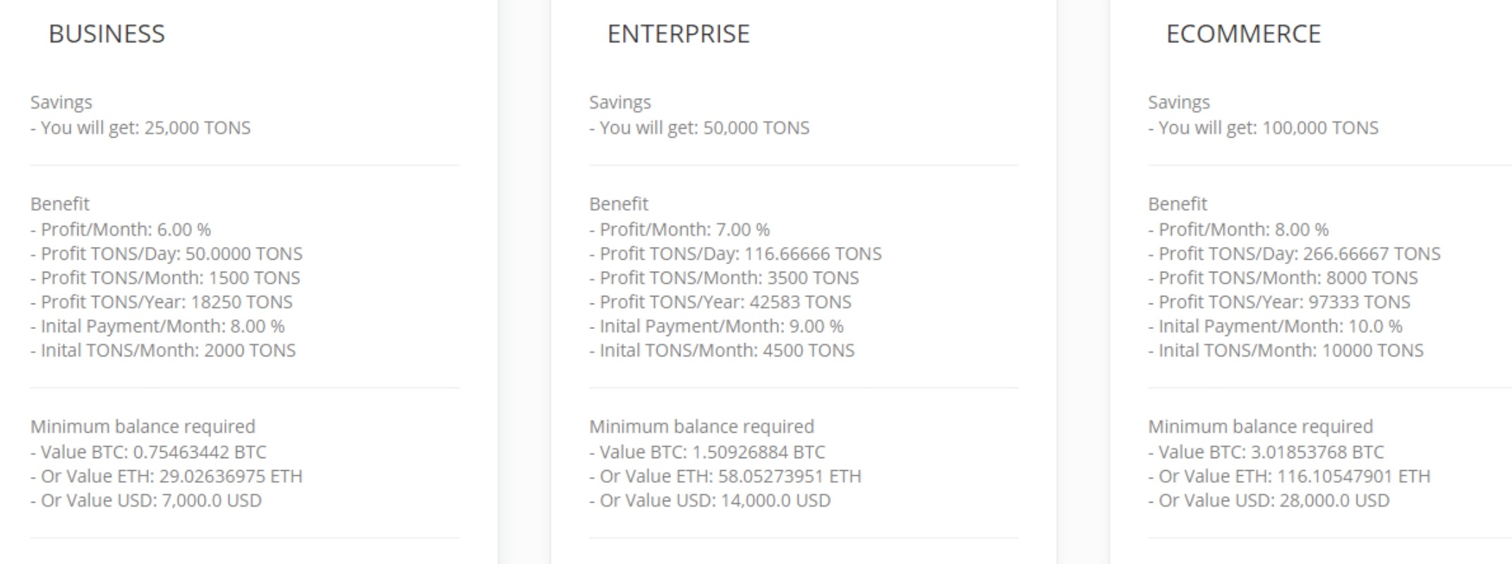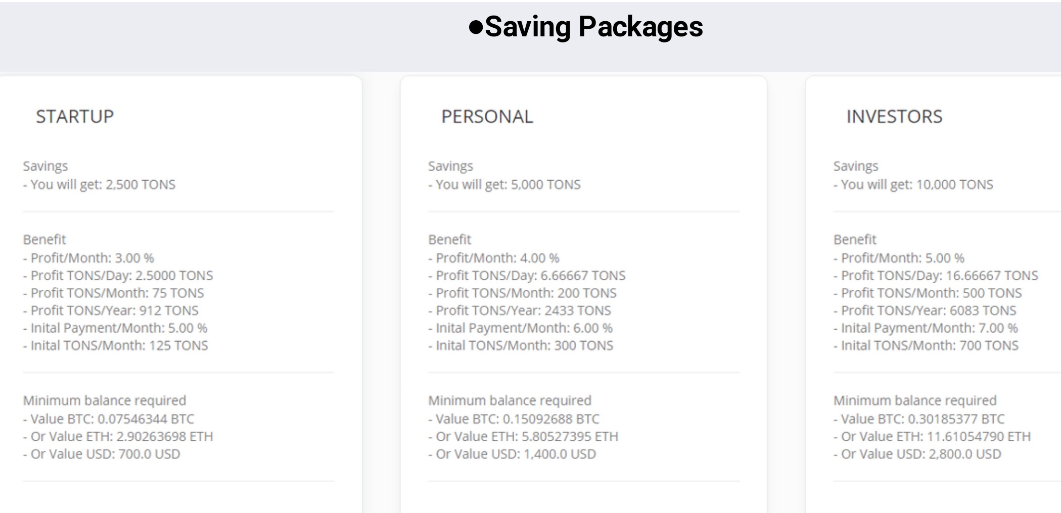 Startup plan: with 700 USD, user will get upto 2500 TONS Token, with 3% monthly benefit, users will get 912 TONS per year.