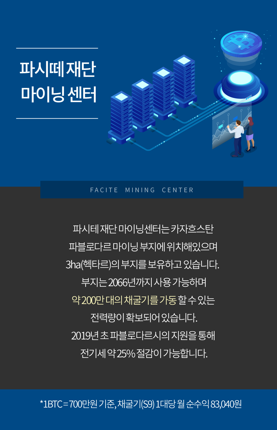 2021년까지 마이닝 머신 200만대 설치를 목표 두고 있는 파시떼는 값싼 전기료와 유리한 지역적조건, 그리고 정부의 지원을 바탕으로 안정적인 수익창출을 할 수 있을 것으로 기대되고 있습니다.