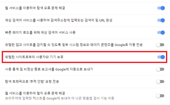 구글 크롬의 세이프 브라우징의 확실한 오진이 아니라면 "위험한 사이트로부터 사용자와 기기 보호" 체크 해제는 권장하지 않습니다.