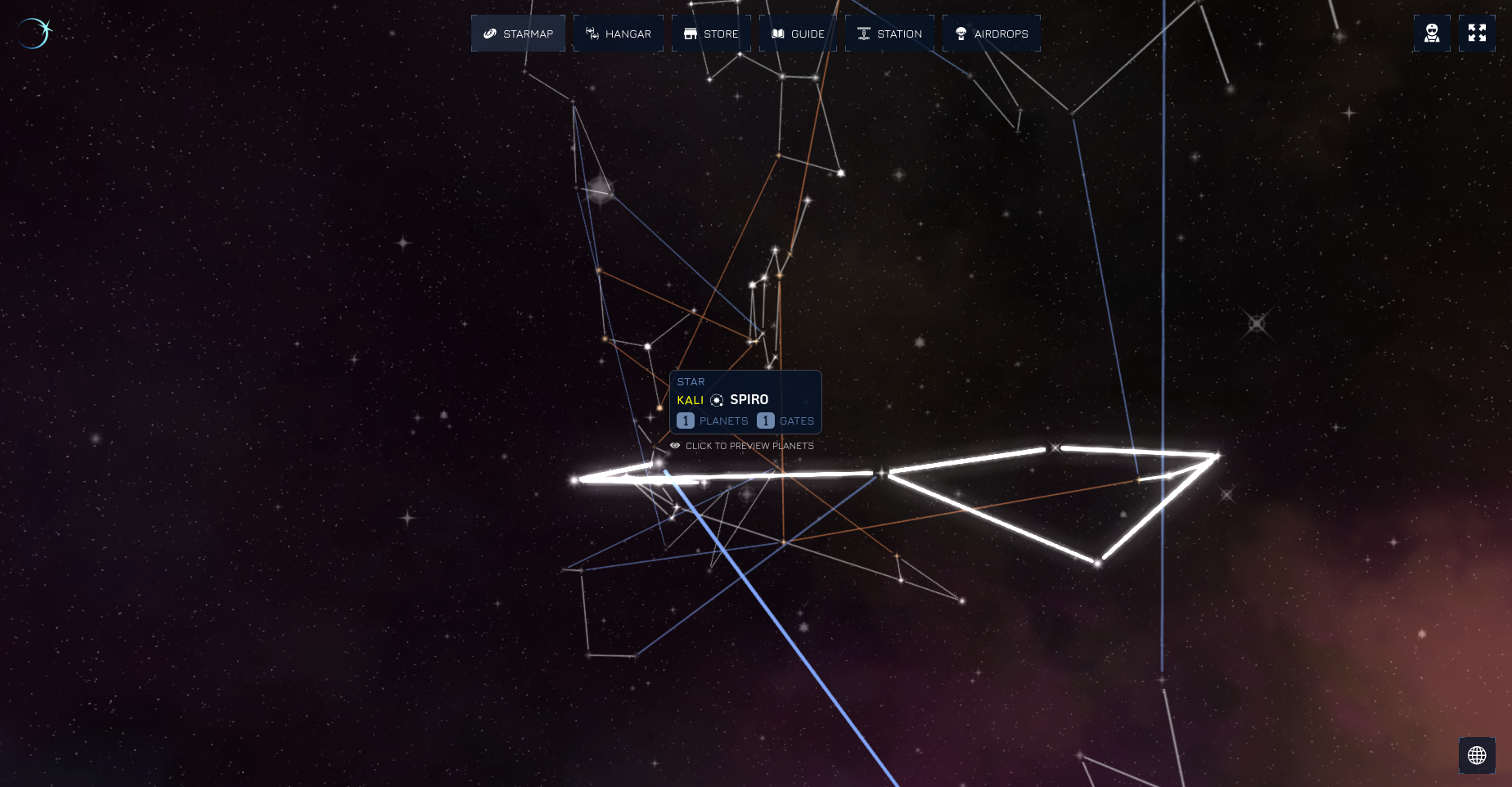 Игровой мир похож на карту EVE с картой созвездий, звёздных систем и планет.