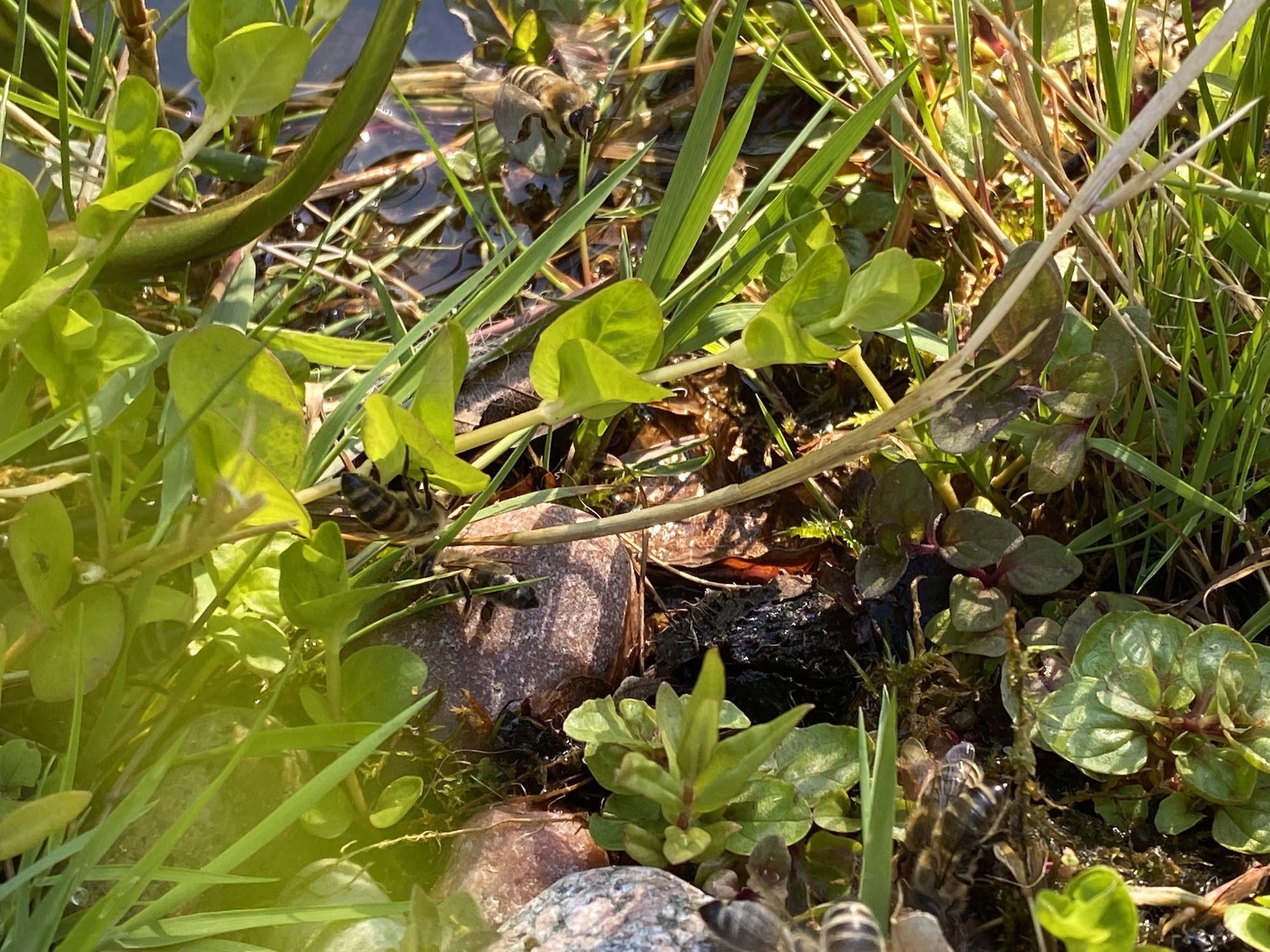 Einen Imker in der Familie zu haben, ist schon was Feines. Neben der regelmäßigen Belieferung mit Honig in leckersten Variationen, Met, Wachs und dem "Wundermittel" Propolis, kann man sich stets auf eine von Begeisterung für das soziale Insekt geprägte Wissensvermittlung des Bienenexperten verlassen. So musste ich kürzlich mal wieder auffrischen, weshalb es an sehr warmen Tagen an unserem Gartenteich vor Bienen nur so wimmelt. Klar müssen die Bienen auch trinken, für ihren eigenen Wasserhaushalt reicht aber der Flüssigkeitsgehalt des gesammelten Nektars, gegebenenfalls noch etwas Morgentau, aus. Am Teich nehmen die Bienen mit ihrem Rüssel mehr Wasser auf, als sie selbst benötigen. Zurück im Bienenstock "würgen" sie das Wasser aus und sorgen durch Flügelfächern für eine angenehme Verdunstungskühle im Nest. Dieses ausgeklügelte Klimatisierungssystem ist in den Sommermonaten überlebenswichtig für die Bienen, denn Stocktemperaturen über 35° C schädigen die Entwicklung der Larven.