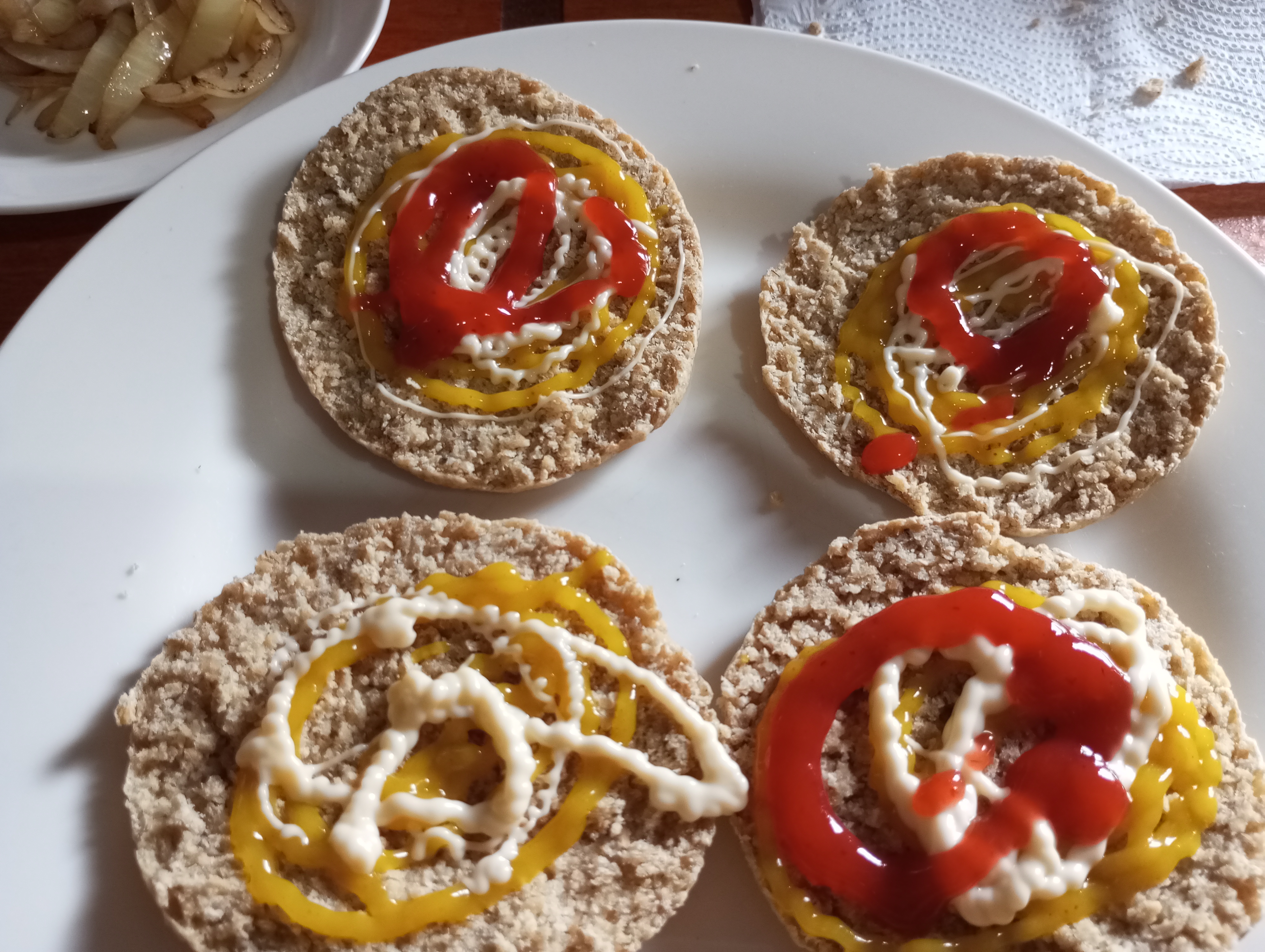 Como el pan estaba bastante doradito no lo puse a calentar solo los abrí en dos y les agregué un poco de las tres salsas y así empezar el proceso.