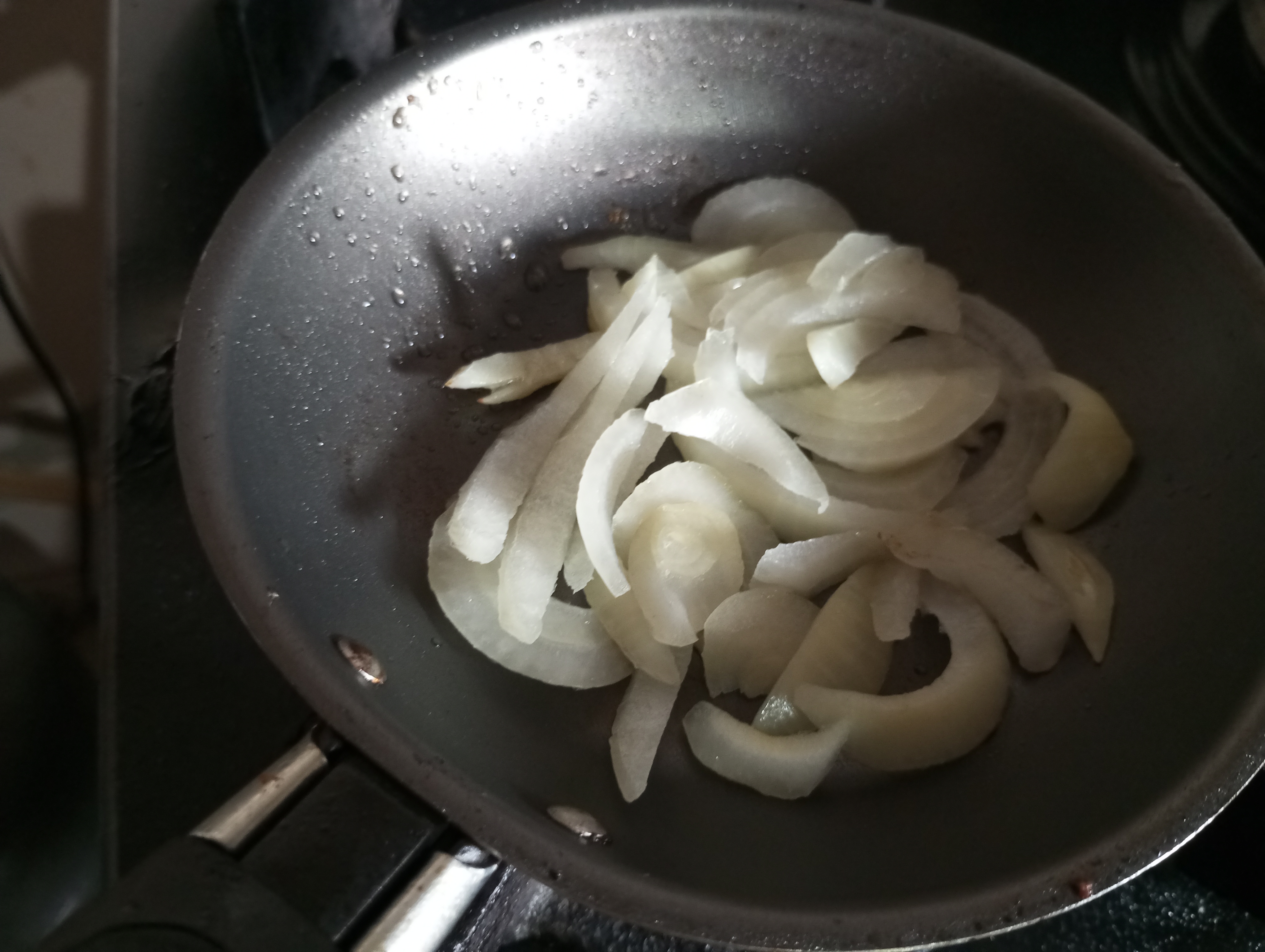 La cebolla la pique en juliana y la lleva al sartén con unas gotas de aceite y las caramelice me gusta más así que crudas.