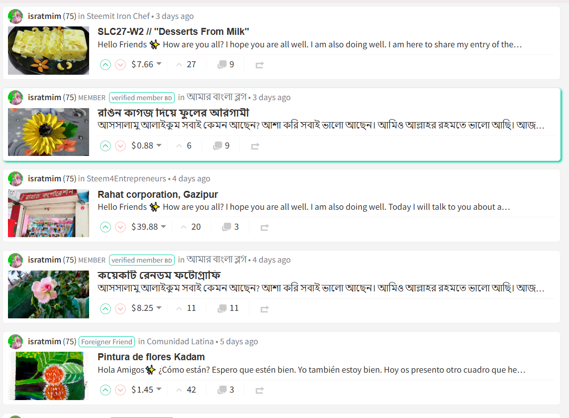 অথরের নাম: ইসরাত জাহান মিম। বর্তমানে অনার্স প্রথম বর্ষে পড়াশোনা করছেন। গ্রামের বাড়ি নোয়াখালীতে কিন্তু বাবার ব্যবসার কারণে বর্তমানে তিনি অবস্থান করছেন গাজীপুরে। স্টিমিট প্ল্যাটফর্মের "আমার বাংলা ব্লগ" পরিবারের একজন সদস্য হওয়ায় তিনি অনেক উৎসাহিত ও আনন্দিত। বই পড়তে তিনি পছন্দ করেন, সেই সাথে নতুন নতুন ফটোগ্রাফি করতে ও ইউনিক রেসিপি এবং নতুন নতুন ইউনিক ডাই তৈরি করতে বেশ পছন্দ করেন। তবে সবচেয়ে বেশি ভালো লাগে বিভিন্ন নতুন নতুন জায়গায় ঘুরে বেড়াতে ও প্রকৃতির কাছাকাছি থেকে প্রকৃতির অপরূপ সৌন্দর্য অবলোকন করতে। তিনি স্টিমিট প্ল্যাটফর্মে যাত্রা শুরু করেন ২০২০ সালের ১৭ই ডিসেম্বর।