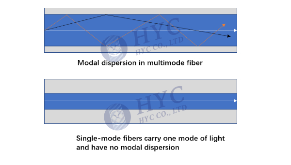 Dispersion in optical fiber includes modal dispersion, chromatic dispersion and polarization mode dispersion. Modal dispersion in optical fibers occurs because different light rays that propagate through a multimode fiber have different propagation delays. So, light shows dispersion due to early reaching and sometimes delay in reaching the other end of the fiber. Chromatic dispersion describes a combination of two separate types of dispersion, namely material dispersion and waveguide dispersion. Material dispersion occurs when the wavelength depends on the refractive index of the fiber core material. The dispersion of optical fiber not only affects the transmission capacity of optical fiber, but also limits the relay distance of optical fiber communication system.