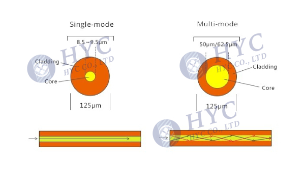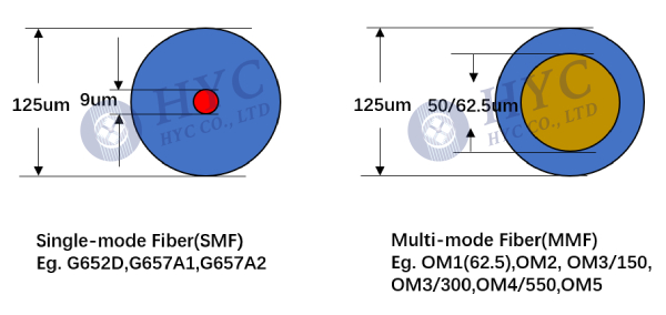 Divided by mode field: single mode (9/125), multimode (50/125, 62.5/125)