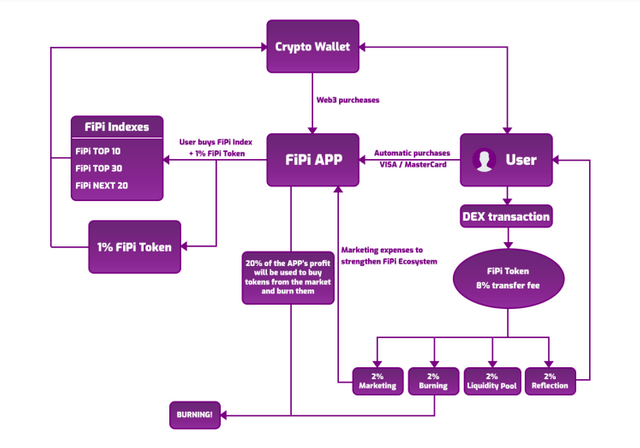 Fiecare indice FiPi Crypto achiziționat va fi însoțit de tokenul nostru – achizițiile ciclice de FiPi Crypto Index vor include achiziționarea a 1% din FiPi Token. Proprietarii săi vor câștiga profit din fiecare tranzacție de cumpărare sau vânzare – fiecare utilizator va câștiga 2% din valoarea tranzacției (reflecție).