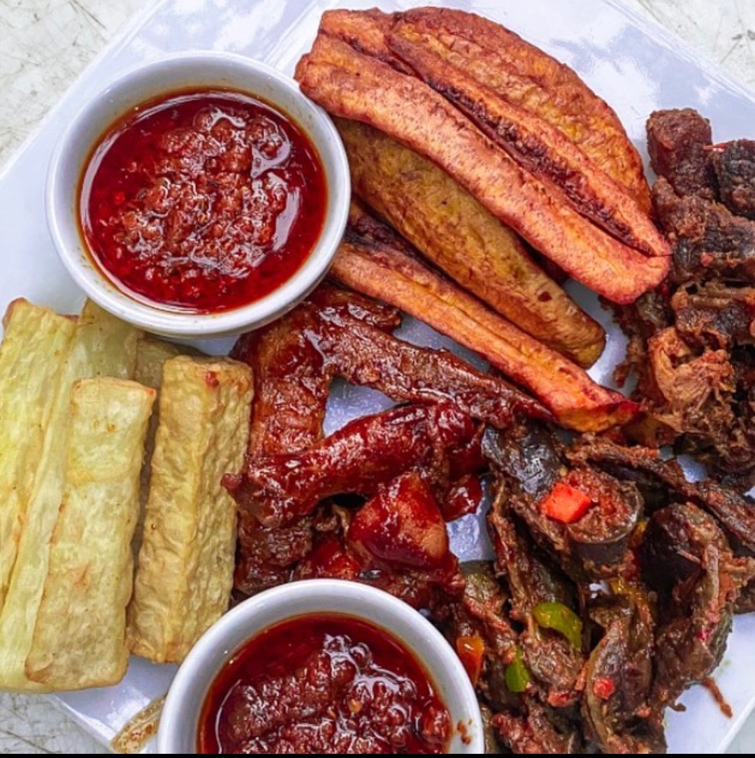 After a while, I see the waiter who attended to us coming in with his hands full, carrying a big tray filled with food: chicken, gizzard, goat meat, peppered meat, fried yam, fried potatoes, fried plantains, different sauces, enough to feed at least 5 people, and the thought hits me that he could be coming to our table with that feast, but I dismiss it with fear already building in my stomach, so I look away and will him in my mind to walk past our table.