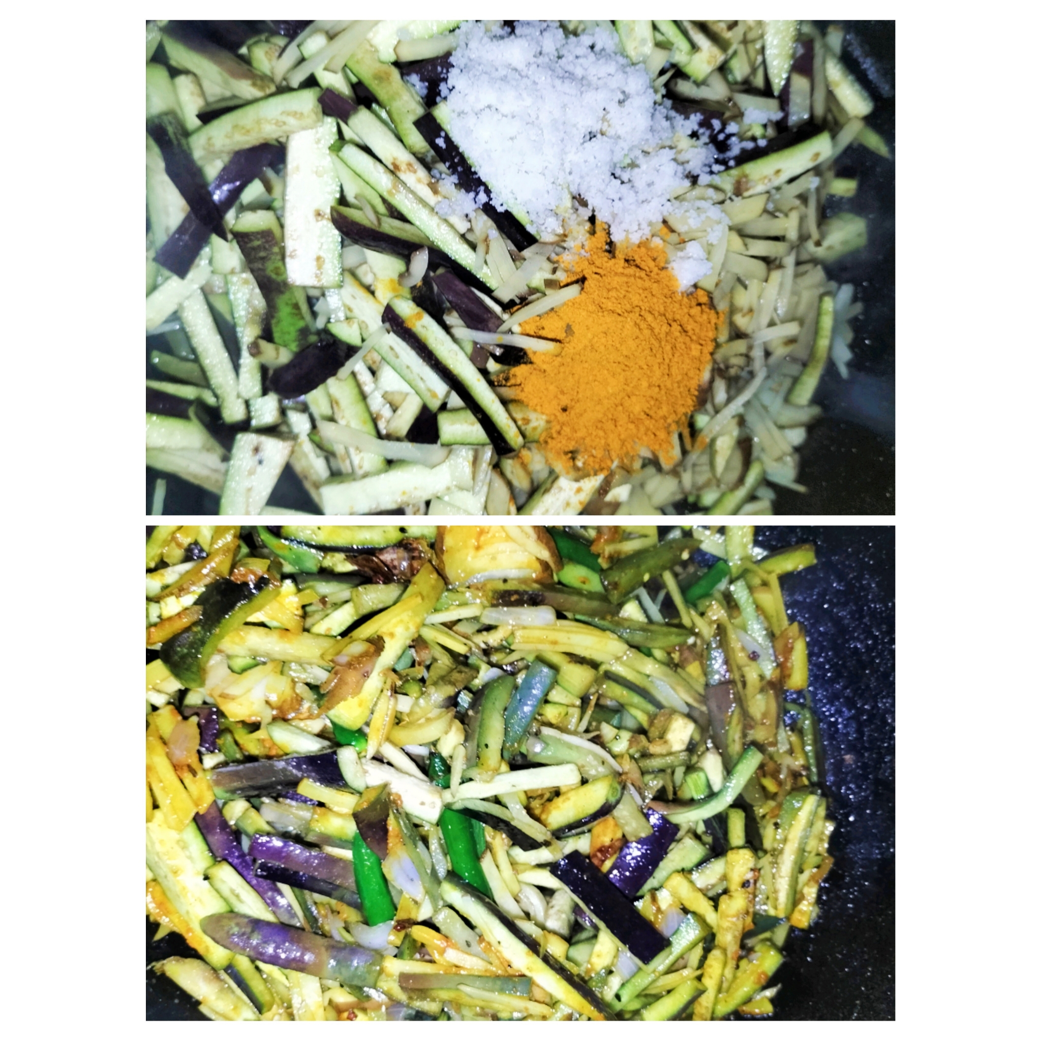 এখন আগে থেকে কুচি করে রাখা আলু বেগুন গুলো কড়াইয়ে দিয়েছি ও লবন হলুদ লবন দিয়ে নারাচারা করে মিশিয়ে নিয়েছি।
