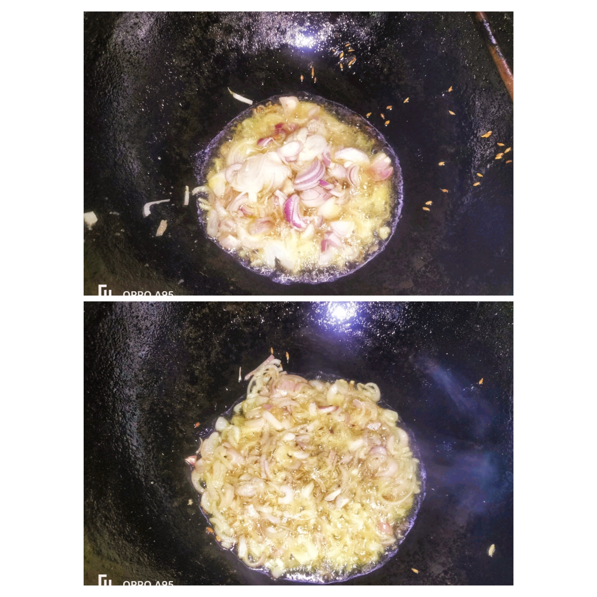 এখন মাছ ভাজা তেলে গোটা জিরা ফোঁড়ন দিয়েছি ও তাতে পেঁয়াজ কুচি দিয়েছি।হালকা ভেজে নিয়েছি পেঁয়াজ কুচি।
