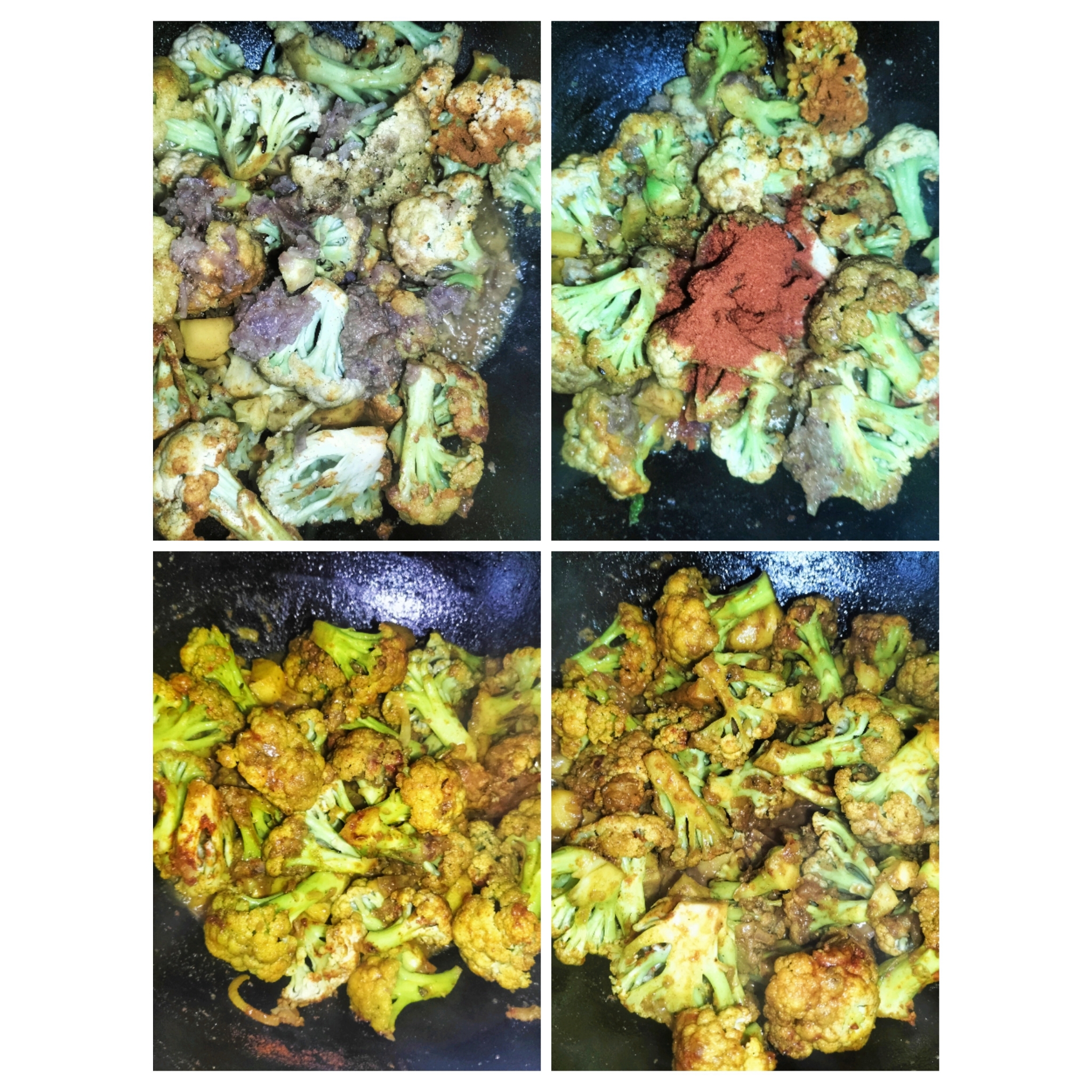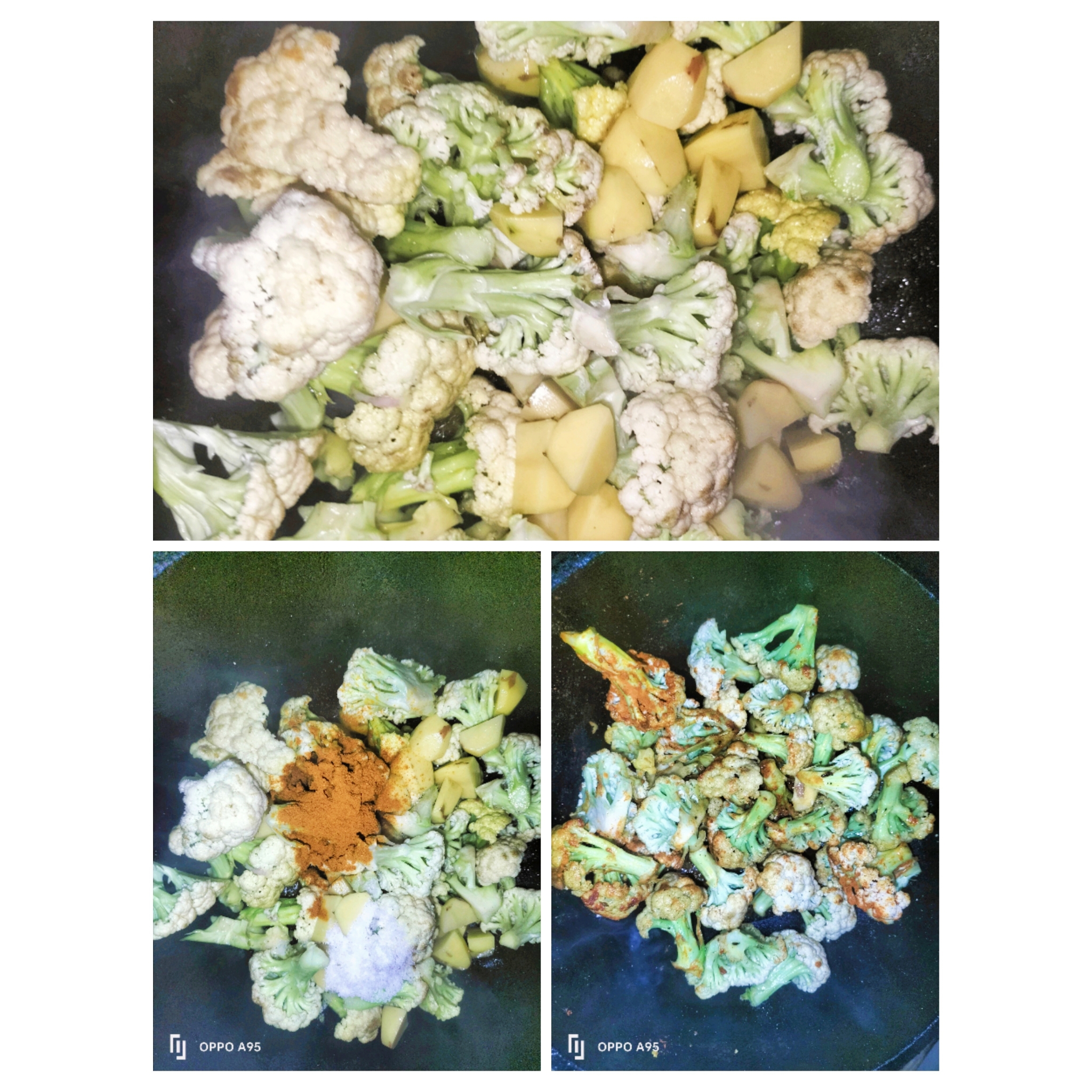 এখন আগে থেকে কেটে জল ঝড়িয়ে রাখা ফুলকপি ও আলু গুলো দিয়েছি এবং তাতে পরিমাণ মতো লবণ হলুদ দিয়েছি ও নারাচারা করে মিশিয়ে নিয়েছি।