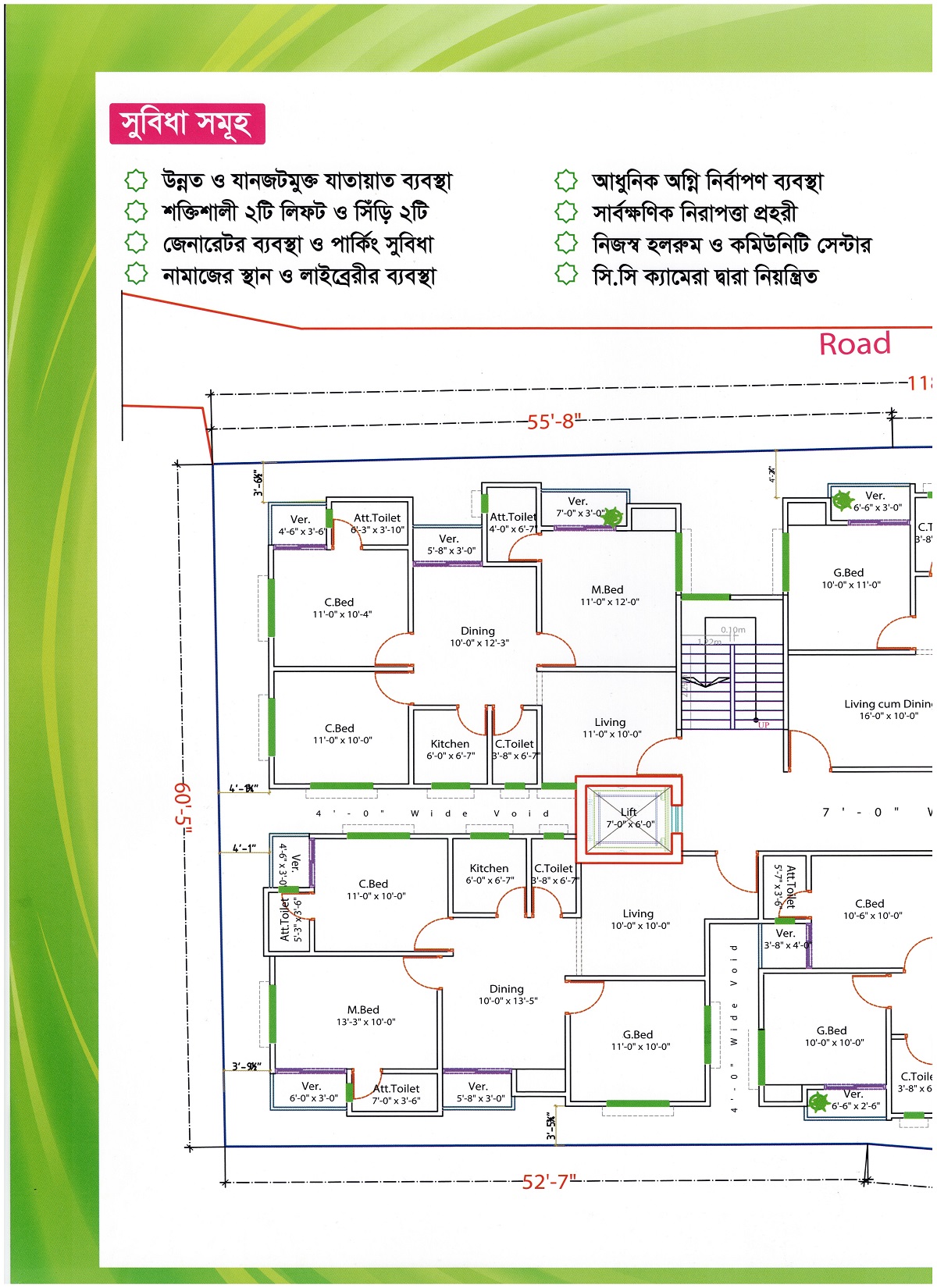 ফ্ল্যাট সংখ্যা : মোট ৯ তলা ৬= ৫৪ টি ফ্ল্যাট