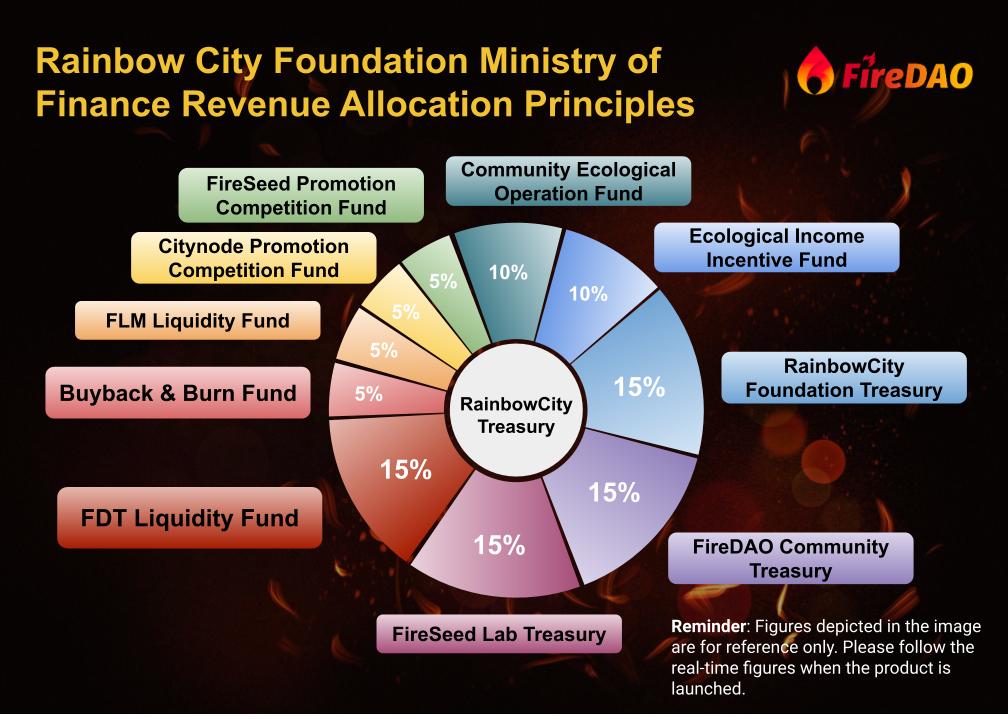 FireDAO's revenue is managed transparently and autonomously through smart contracts, facilitated by RainbowCity Treasury. The revenue generated within the ecosystem is automatically allocated to 10 different funds based on the predetermined ratios. This approach aligns with our steadfast commitment in building a decentralized society.