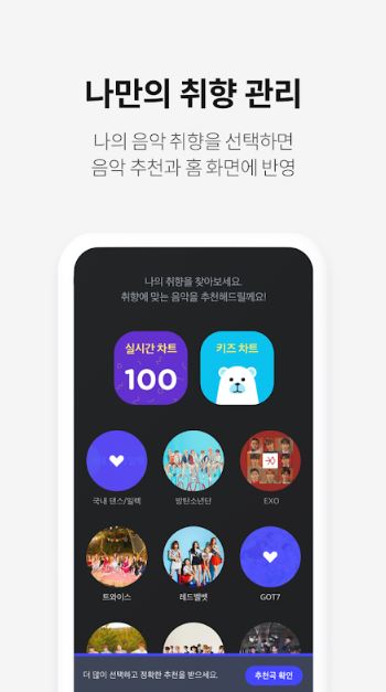 홈 화면에서 나의 음악 감상 취향이 바로 반영됩니다.