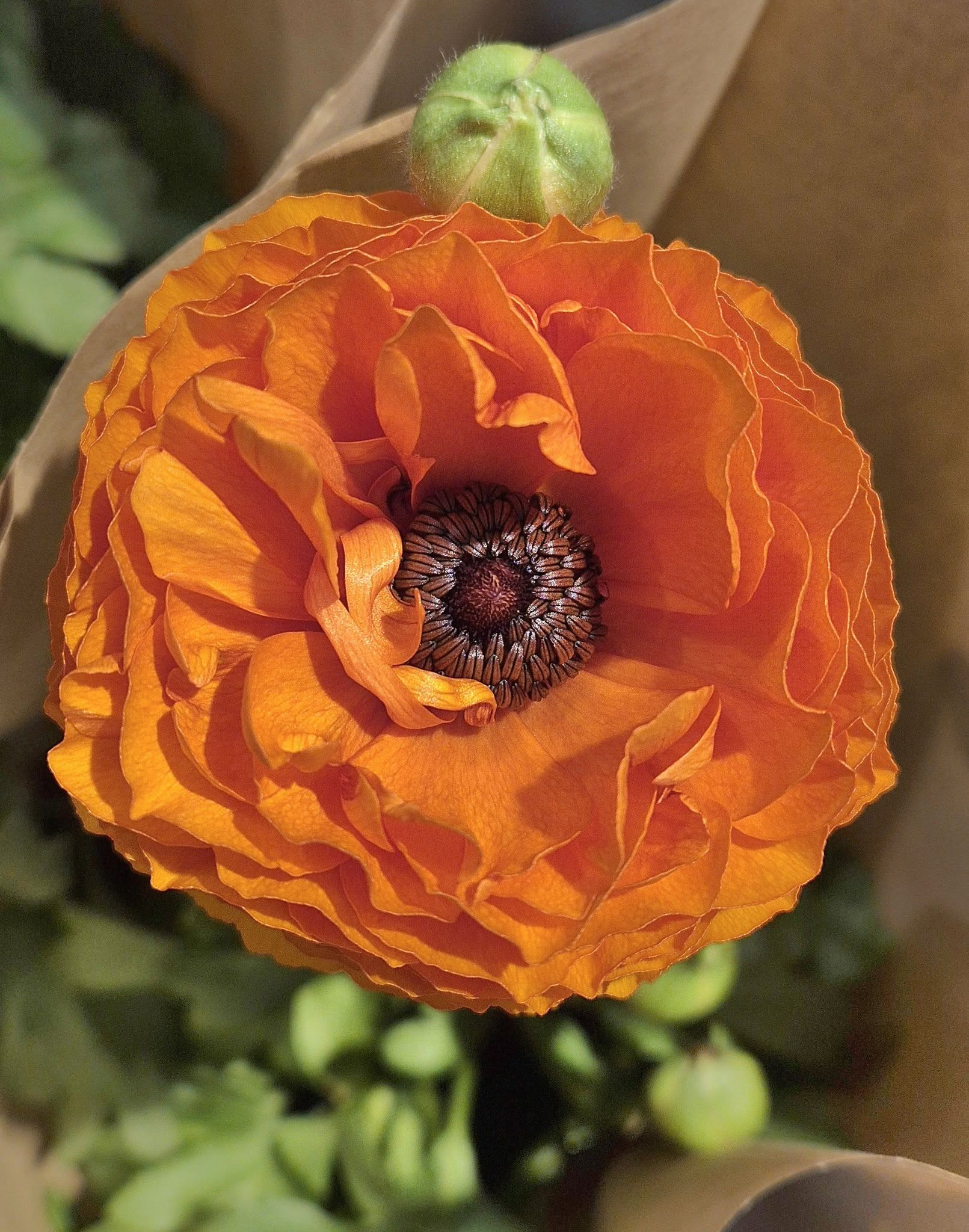 The orange ranunculus blooms like a glowing ember, its countless silky petals unfolding in rich, fiery layers. Shades of tangerine and deep apricot blend seamlessly, creating a warm, luminous heart that seems to hold the light within. Each petal curves gently inward, forming a perfect, rounded bloom that feels both delicate and full of life. Nestled among fresh green leaves, it stands with a soft yet vibrant presence, swaying gently in the breeze. There is a comforting warmth in its glow. The orange ranunculus symbolizes charm, enthusiasm, and the radiant energy of a joyful spirit.