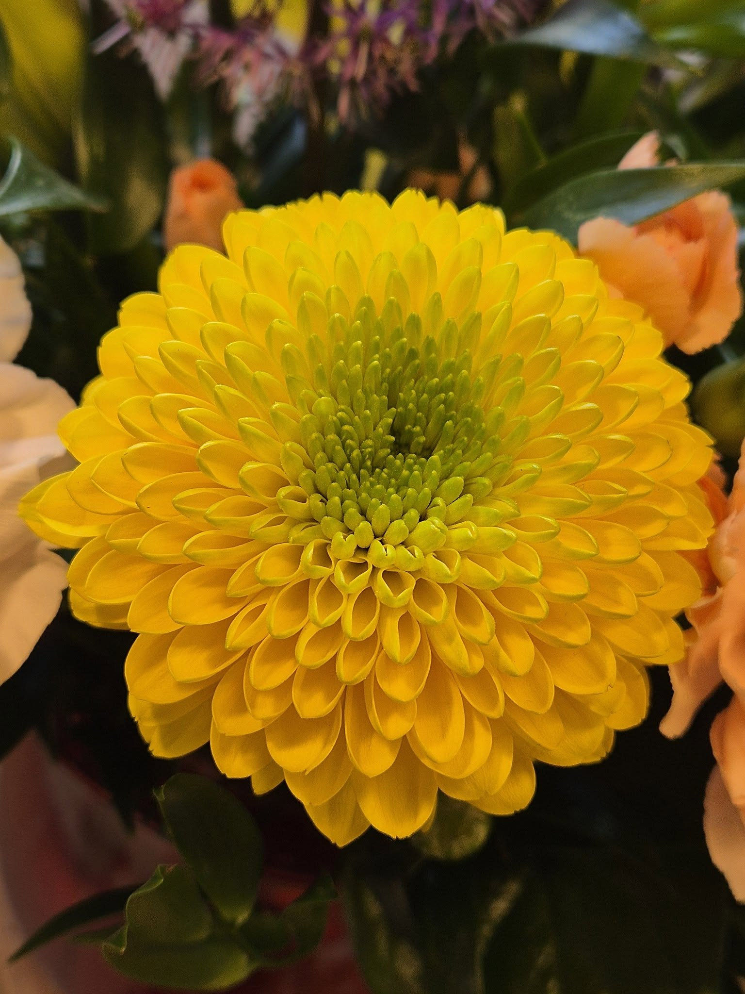 The yellow pompon chrysanthemum blooms in perfect little spheres, its tightly packed petals forming a soft, cushion-like globe of golden light. Each petal is small and neatly curved, layered with gentle precision to create a bloom that feels both playful and refined. The rich yellow hue glows warmly, standing out against deep green, serrated leaves that cradle the flower below. It sways lightly on slender stems, bringing a sense of cheer and harmony to its surroundings. There is a quiet completeness in its form. The yellow pompon chrysanthemum symbolizes happiness, longevity, and the radiant warmth of a joyful heart.
